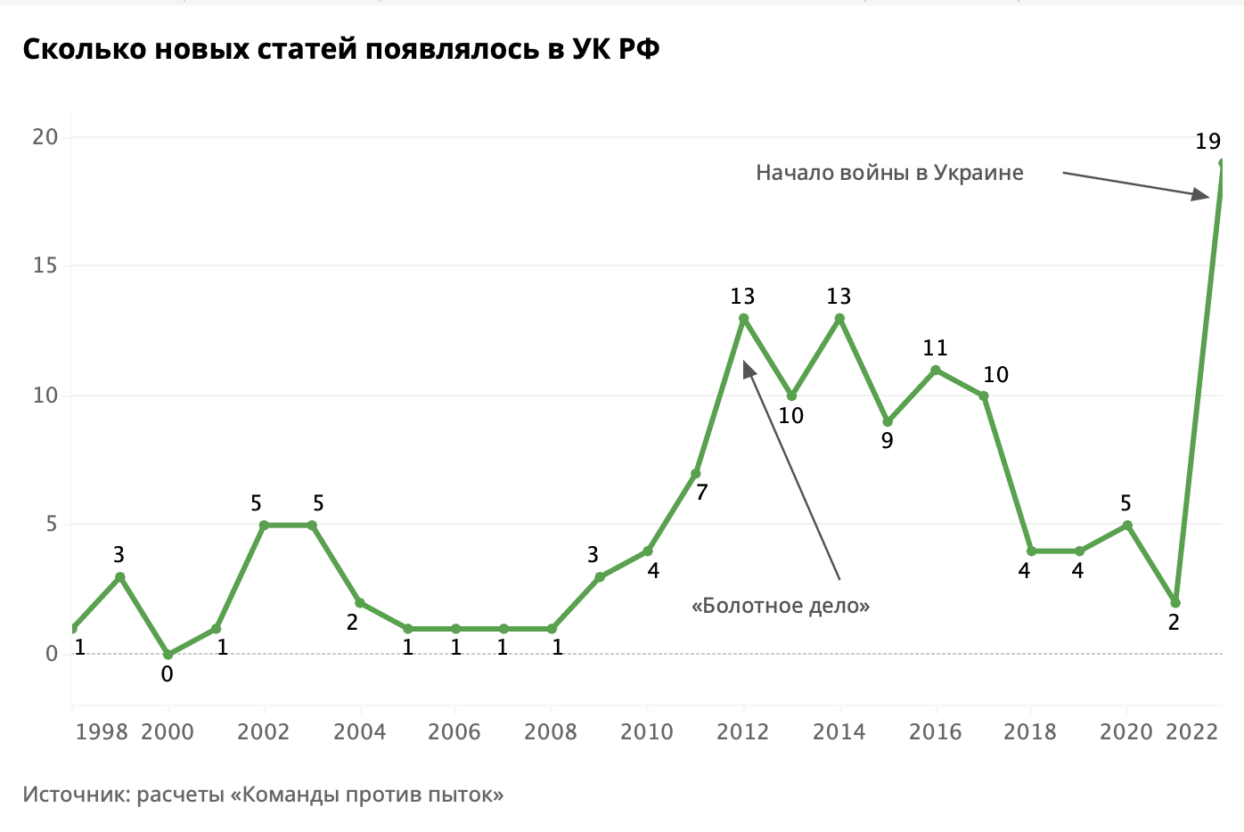 Издание «Медиазона» и правозащитный проект «Команда против пыток» назвали 2022 год «самым карательным» в истории российского Уголовного кодекса — в нем появилось рекордное количество новых статей и составов преступлений, сообщается в исследовании журналистов и правозащитников.