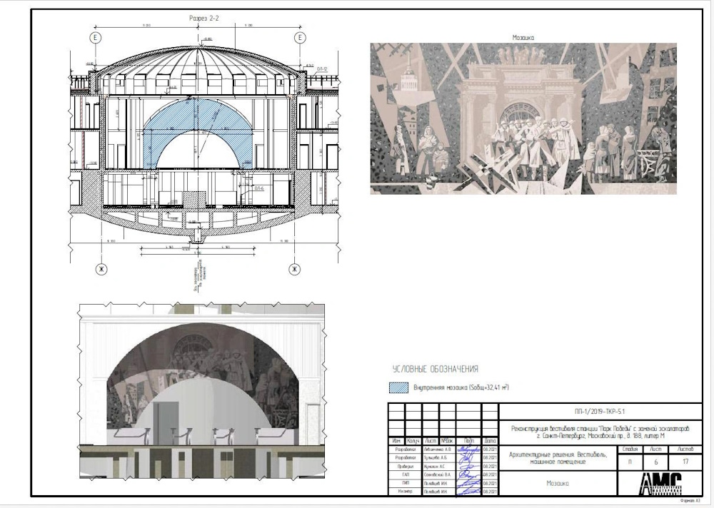 Входные группы и верхнюю площадку эскалаторов оформят с помощью мозаичных панно. На одном изобразят Георгия Победоносца, на другом — Нарвские ворота, откуда отправлялись на фронт воины Красной Армии.