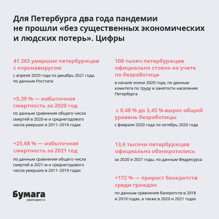 «Бумага» показывает на инфографике, какие экономические и человеческие потери понес Петербург за два года пандемии.