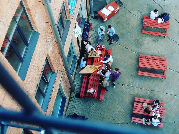 Во дворе «Бертгольд Центра» тоже стоит уличная мебель. За общими столиками, например, заметили посетителей Oversize pizza. В кафе «Бумаге» подтвердили, что люди заказывают пиццу и напитки навынос и сидят на территории кластера.