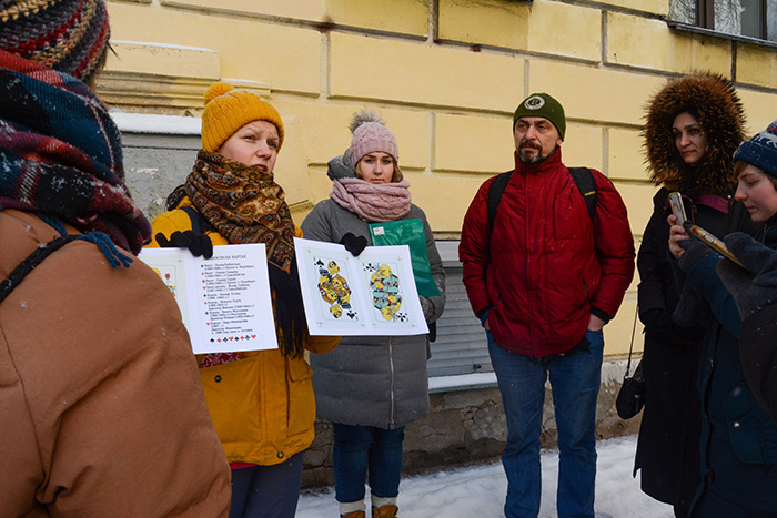 Музей занимается историей Невского района, а как раз на его территории располагается карточная фабрика (Императорская Карточная фабрика — прим. «Бумаги»), которая работала в советское время. Она в том числе известна тем, что зимой 1942 года, в разгар блокады, там были созданы антифашистские игральные карты художника Власова. Во время челленджа мы проходим маршрут, который он [частично] проходил зимой 1942 года — от Васильевского острова до станции метро «Пролетарская». Власов приходил на фабрику, чтобы узнать детали производства игральных карт.