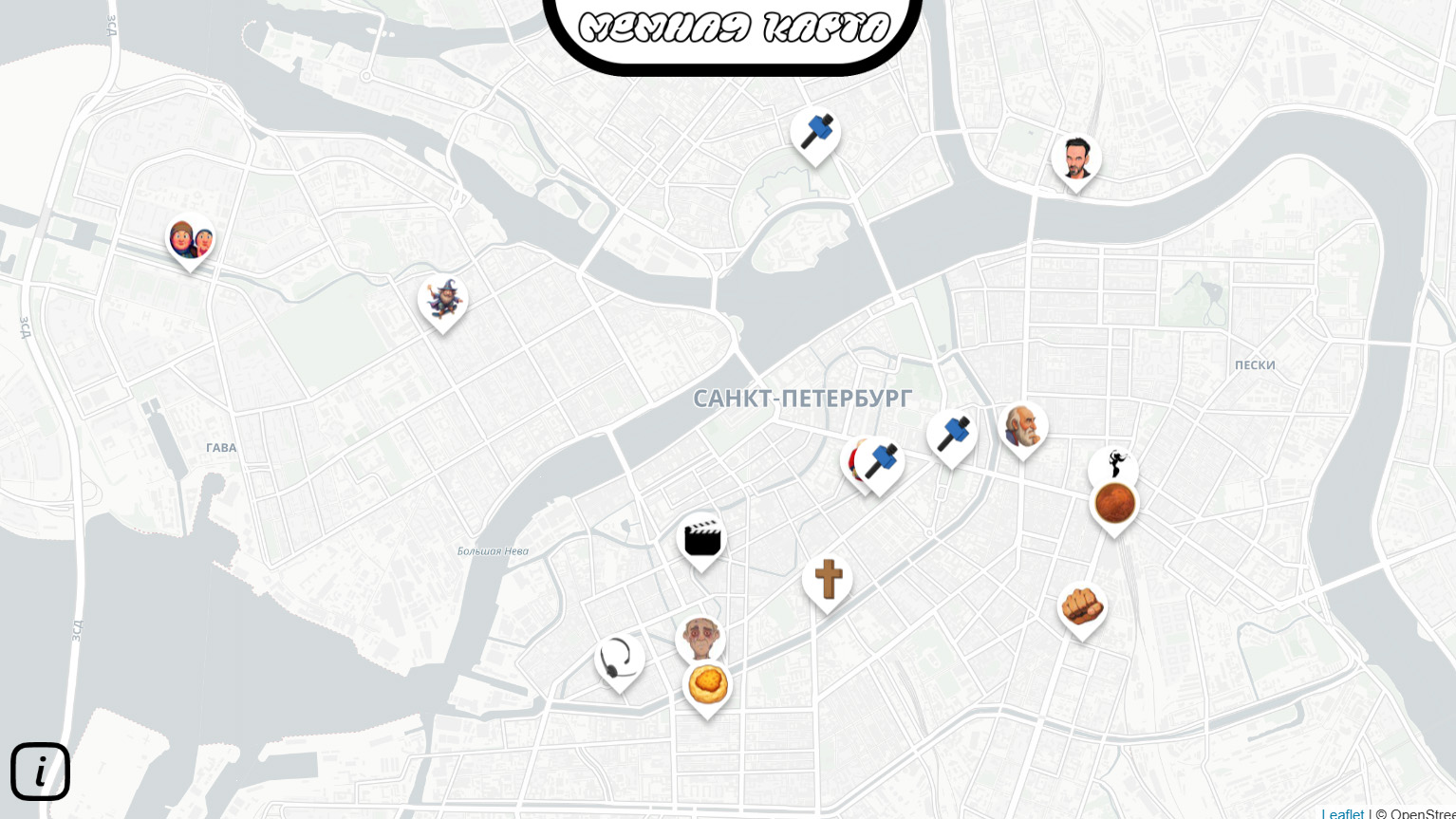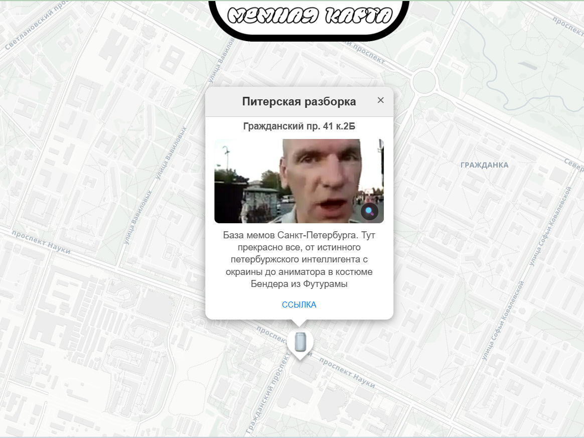 Полгода назад менеджер одного из городских автосервисов Игорь Громов решил сделать карту самых мемных локаций Петербурга. Сейчас на ней больше 30 точек, в их числе легендарные мемы, вышедшие далеко за пределы Петербурга. Например, Наталья Морская Пехота или «Котлетки с пюрешкой».