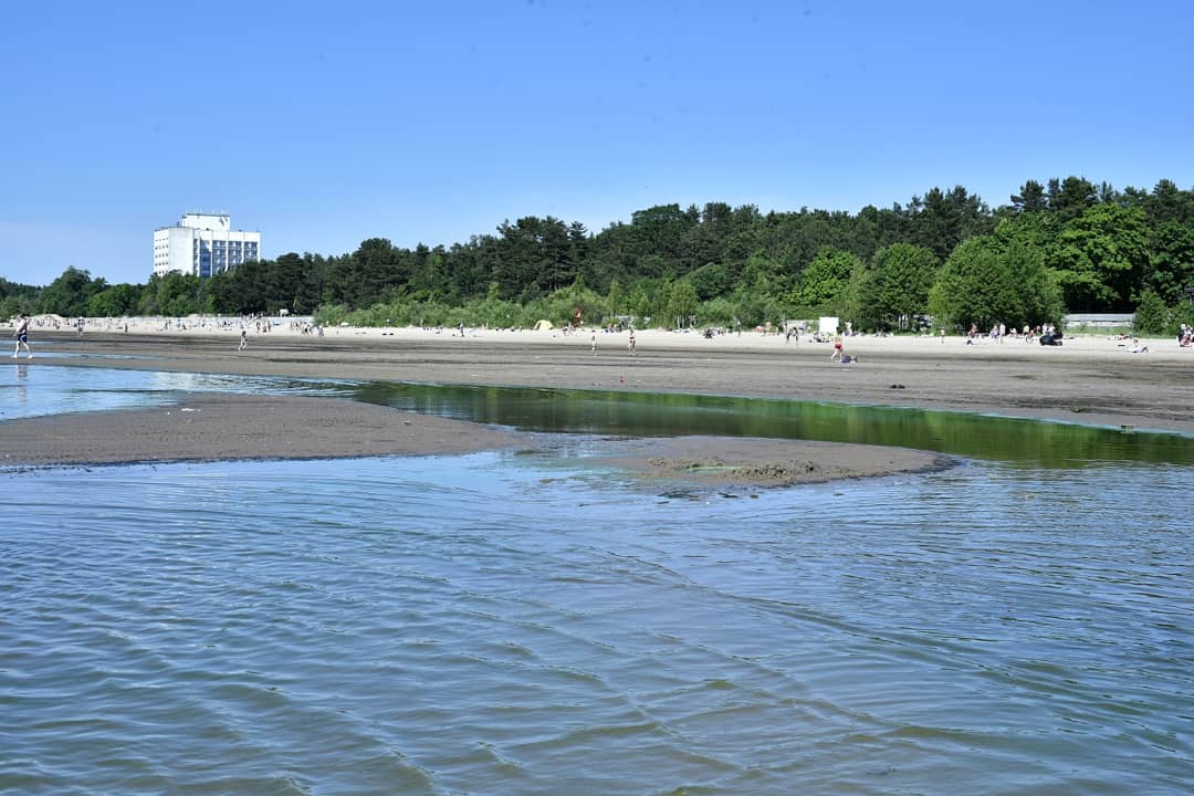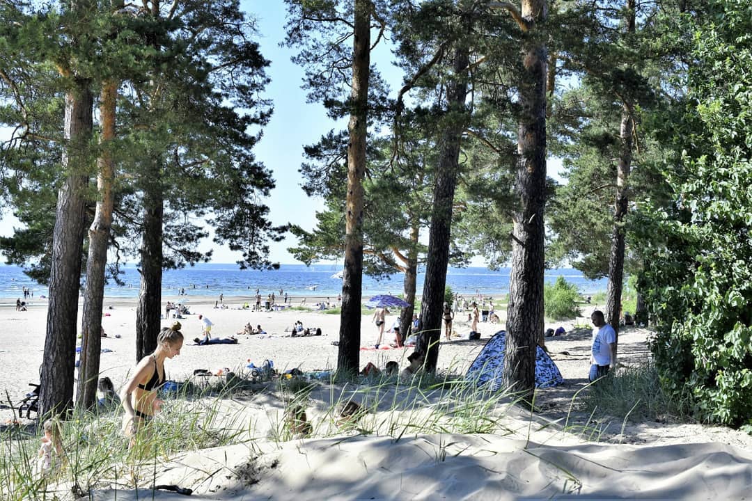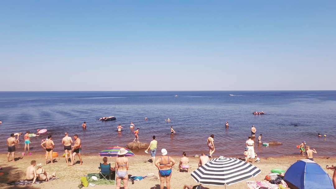 На заливе в Сестрорецке люди купаются и разбивают на берегу палатки.