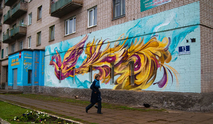 Что может удивить зашоренного стереотипами жителя мегаполиса, так это множество детей в областном городе. Несколько месяцев назад пикалёвцы своими силами убрали и вдохнули новую жизнь в серый и скучный некогда двор на Заводской улице. Теперь детей радует разноцветная площадка и забавная картина на кирпичной стене. Проект Глеба Тюрина позволил школьникам Юре и Илье вместе с товарищами разукрасить прежде безликие стены детской библиотеки. Огненная Жар-Птица словно пролетает по улице Металлургов, где стоит библиотека.