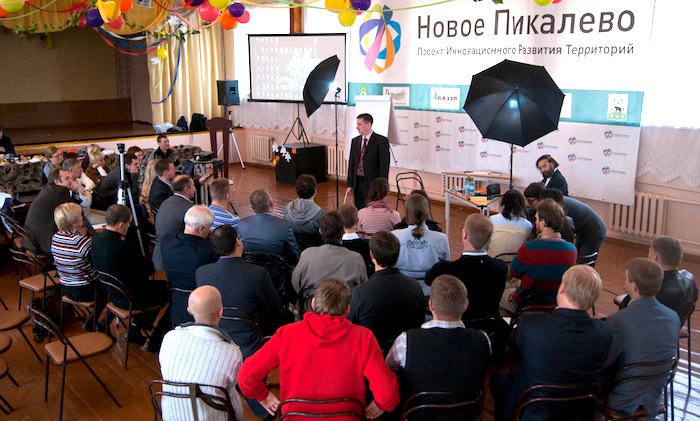 С Глебом Тюриным Бергманн лично знаком всего неделю, до этого они общались в сети. И вот профессор сидит в пикалёвской школе перед главой администрации города, директором одного из глиноземных заводов, местными предпринимателями и сторонниками экопоселенчества. Слушатели съехались из Выборга, Бокситогорска, Кингисеппа, Лодейного поля, Волхова, Тихвинской области, Подмосковья, республики Коми, Валдая.