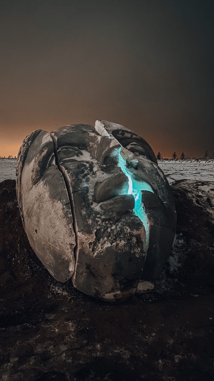 По Васильевскому острову почти год перемещается гигантская голова с трещиной — словно с картин Сальвадора Дали. Откуда она взялась?