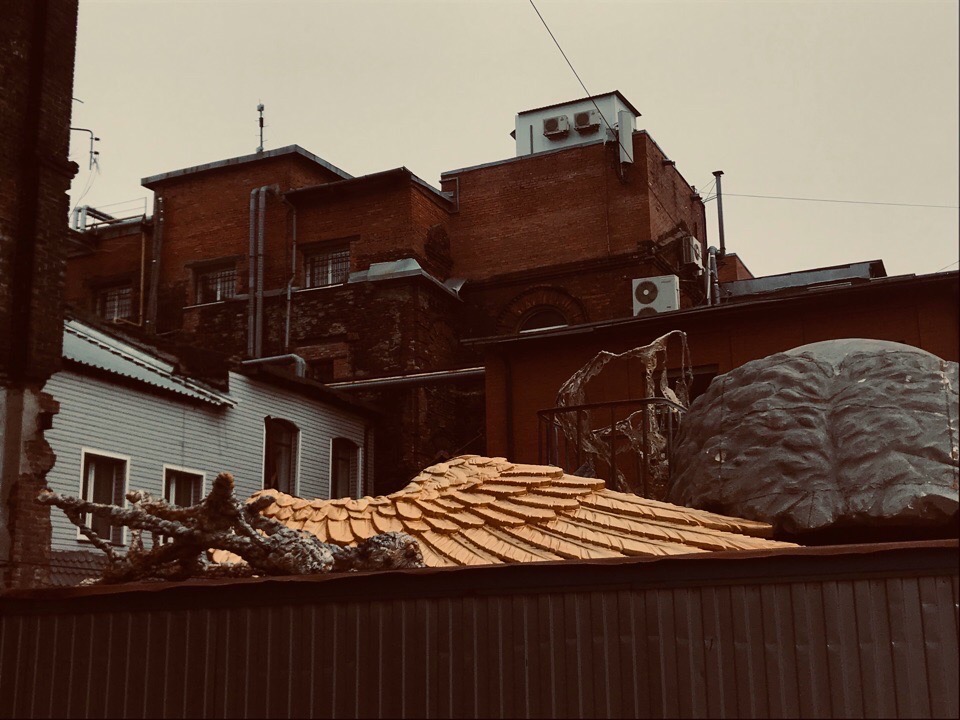 Весной во дворе дома на Уральской улице местные жители заметили гигантскую голову. Она лежала в мусорном баке, а рядом с ней торчали белые руки и золотые крылья.