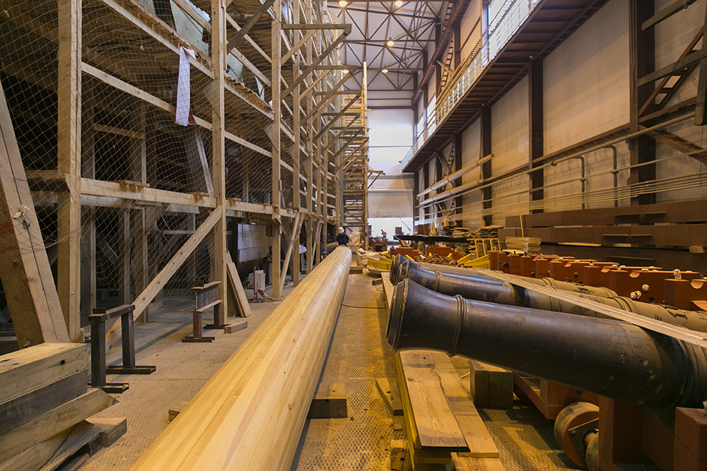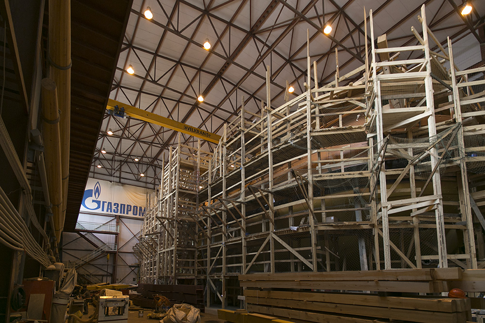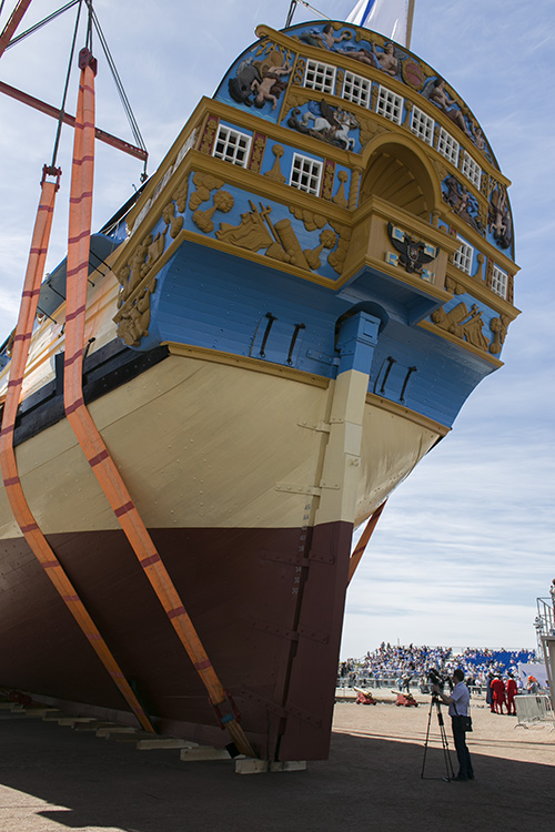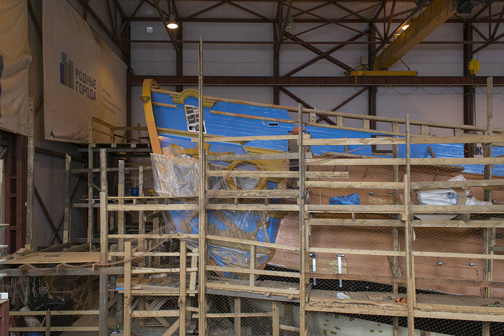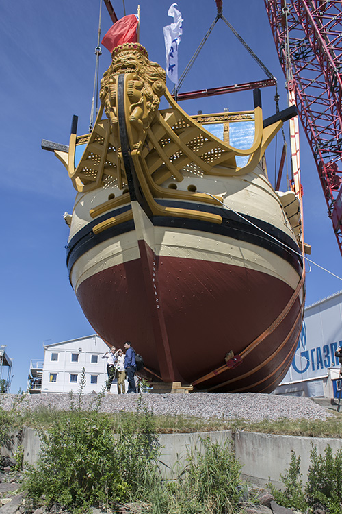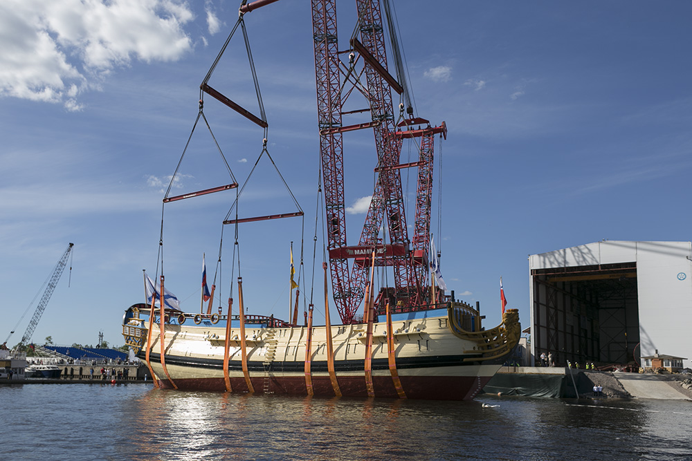 На установку мачт, дополнительных пушек, укрепление балласта, оформление интерьера и экспозицию об истории российского флота, по оценке кораблестроителей, потребуется еще год. Но экскурсии будут продолжаться, их приостановили только с 21 мая по 15 июня из-за работ по спуску корабля на воду.