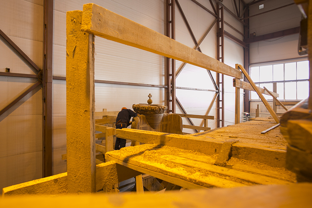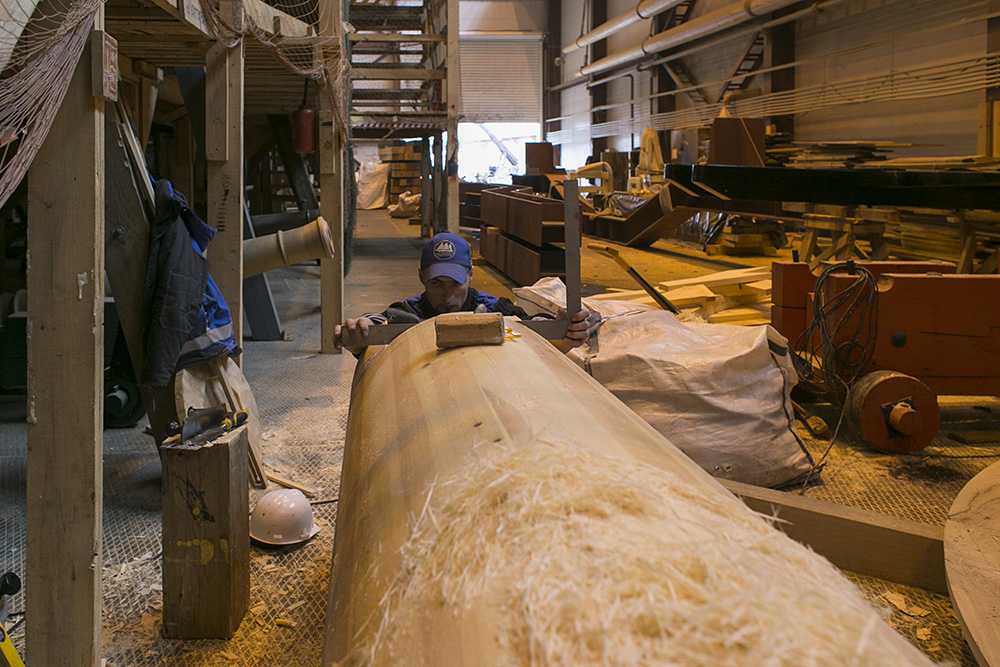 — Например, в петровские времена больше использовали нагеля (деталь парусного судна в виде деревянного или металлического стержня — прим. «Бумаги»), железный крепеж, сейчас мы отдаем предпочтение металлу, — рассказывал главный строитель современного корабля Михаил Плеханов. — Другой пример: при Петре, чтобы согнуть доску, ее отжигали, снимали внутренние напряжения на открытом огне. Мы для этих целей приобретаем парогенератор — процесс тот же, но с паром работать удобнее.