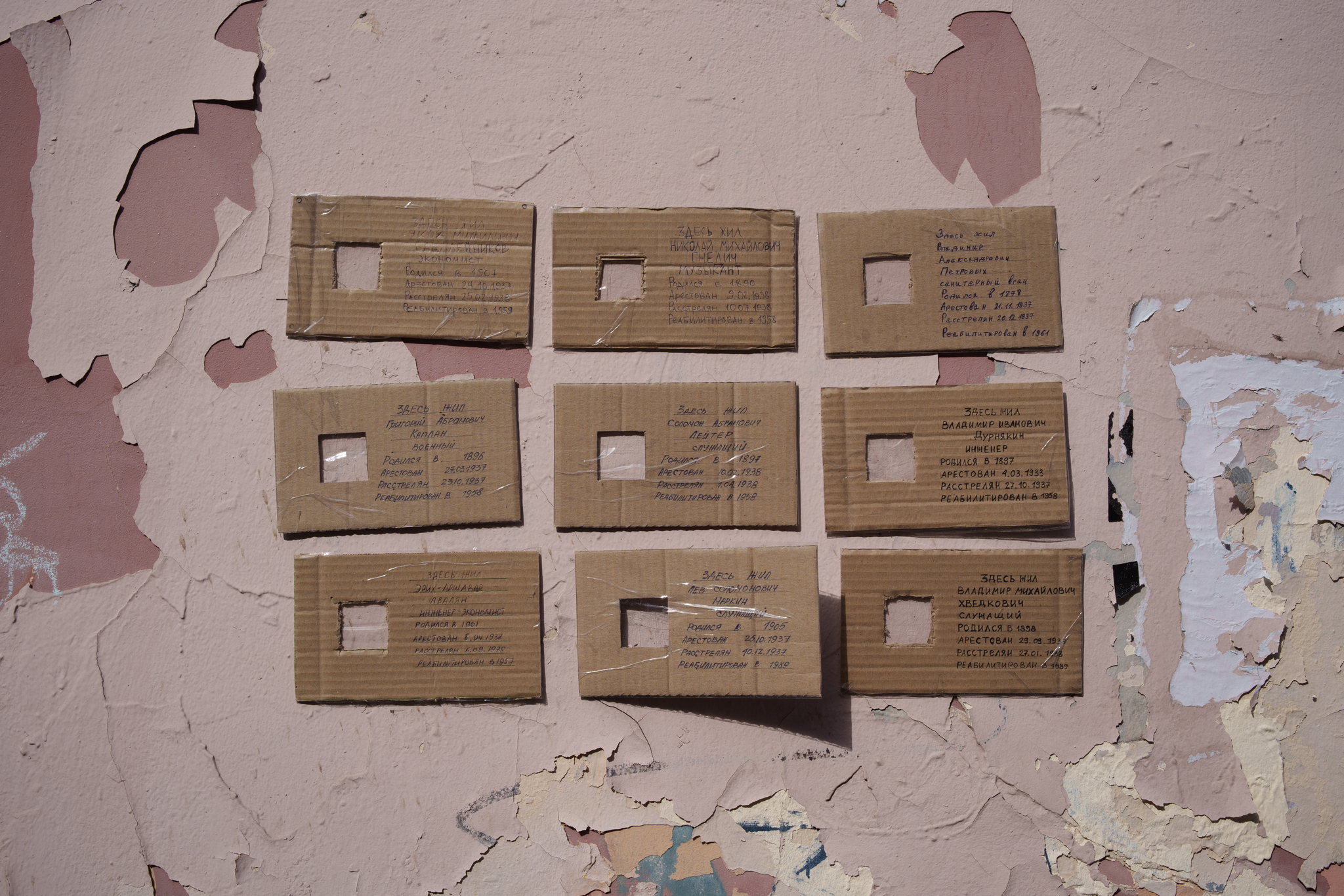 Летом 2024 года на доме появились картонные копии — как узнала «Бумага», снятые таблички по всему городу заменял неравнодушный петербуржец Евгений Жумабеков. В тот же день копии сорвали, но Евгений их восстановил.