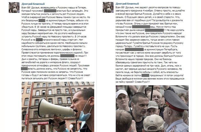 Скорее всего, речь идет о записях, которые в прошлом году публиковались в канун петербургского «Русского марша» на странице Евтушенко «ВКонтакте». Пользователь с именем Дмитрий Бешеный призывал своих единомышленников выходить на несогласованные акции в центр города, жечь пиротехнику, нападать на приезжих и полицейских. На данный момент записи удалены, но «Бумага» располагает их скриншотами. По этическим причинам мы не цитируем их полностью.