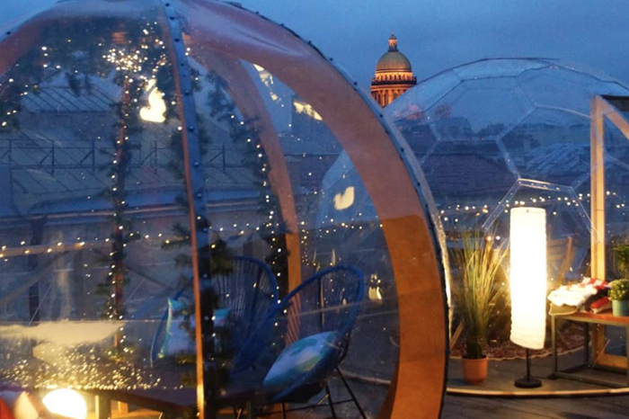 В конце ноября бар «Небо и вино» на крыше особняка в переулке Пирогова установил три прозрачных домика-террасы. Гости публикуют в социальных сетях свои фотографии, а телеграм-каналы окрестили площадку «террасой эпохи социальной дистанции».