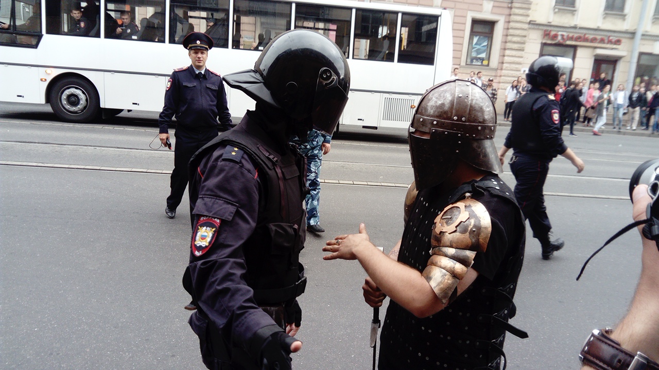 Мужчина в костюме рыцаря всю акцию шутил с полицейскими. В итоге его задержали