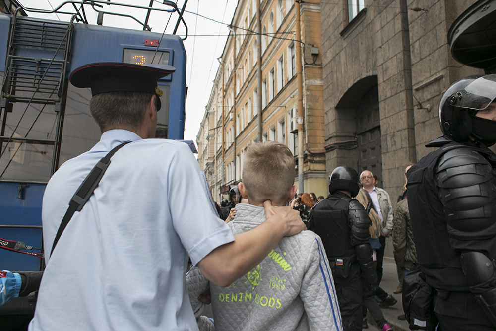 Через несколько минут ребенка спустили со столба полицейские. В автозак мальчика, заломив ему руки, вел один из сотрудников полиции. Подросток плакал. Его завели в автобус вместе с другими задержанными.