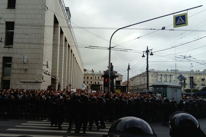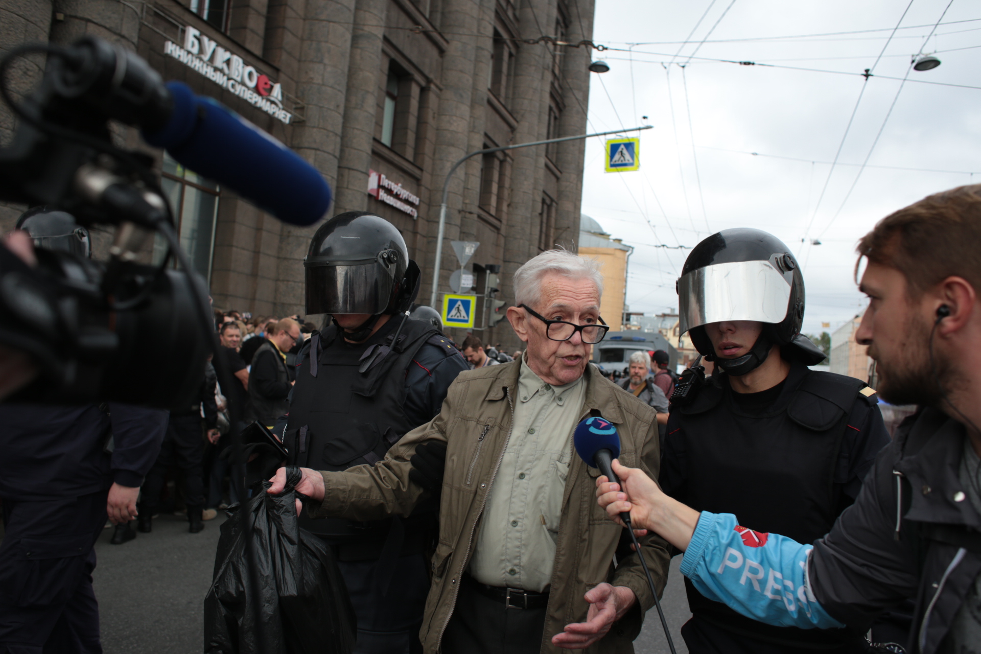 Пять историй с акции протеста в Петербурге. Полицейский говорит с «рыцарем», 80-летнего пенсионера задерживают, школьник сбегает из автозака