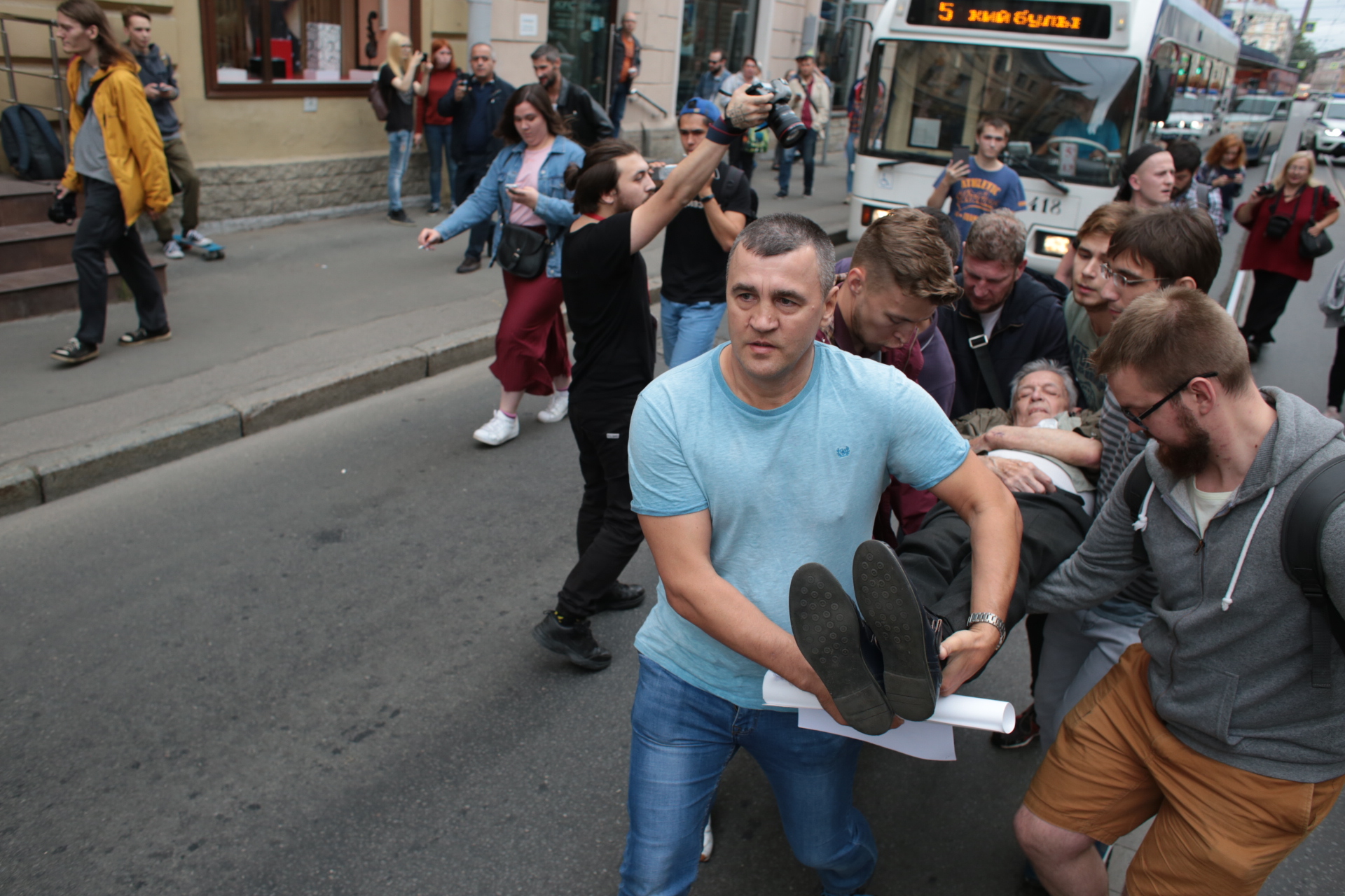 К автобусу мужчину заводили уже четверо — он пытался сопротивляться и требовал «начальника». Толпа освистывала полицейских: «Дедушку-то за что!». Наконец полицейские грубо схватили 80-летнего и затащили в автобус.