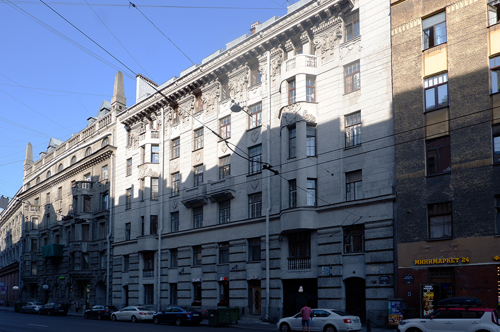Этот дом — как раз представитель последнего поколения дореволюционных доходных домов. Его построили для хозяина фортепианной фабрики Дидерихса архитекторы Алексей Бубырь и Николай Васильев. Но почерк авторов «дома из „Питер FM“» на Фонтанке и «Подписных изданий» на Литейном здесь едва узнаваем. Первоначальный подчеркнуто минималистичный вариант фасадов в духе северного модерна архитекторы переделали на классический лад: добавили могучие капители, картуши с инициалами владельца, богатую отделку входных групп, карниз с львиными масками. Совершенство пропорций и элегантное величие — таким мог бы быть девиз строителей этого дома.