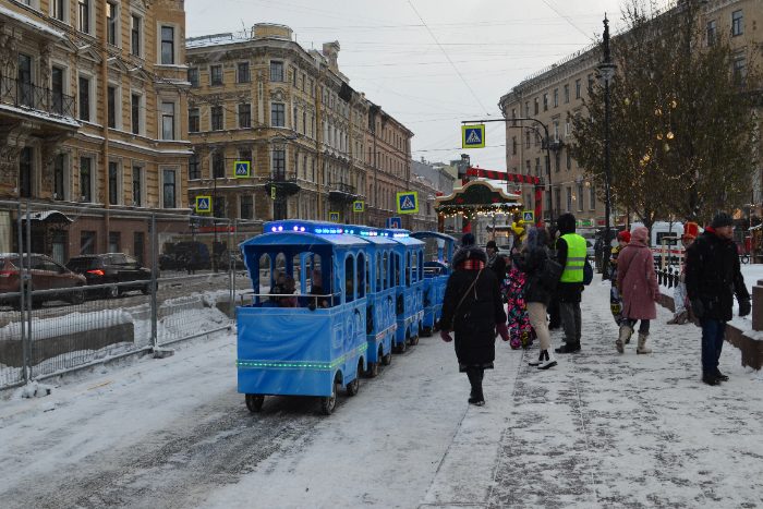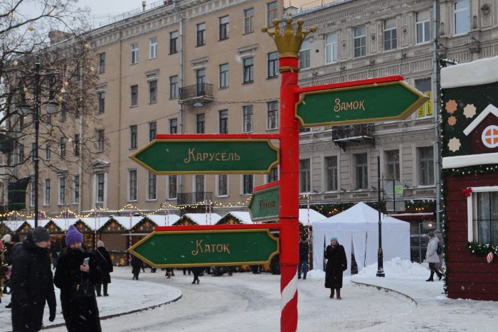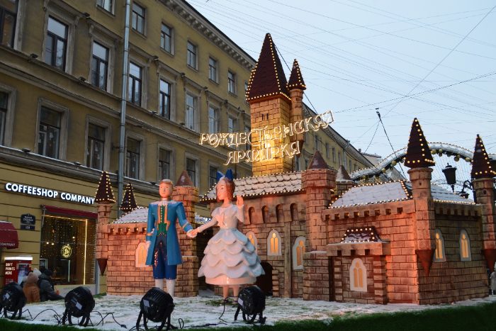В этом году рождественская ярмарка проходит на трех площадях. Основная часть расстилается вокруг Манежной. Так, на Малой Садовой улице установили замок с героями сказки «Щелкунчик» Францем и Мари. Далее расположились стилизованные под зимние домики торговые павильоны, где продают новогодние елочные украшения, мягкие игрушки, керамику, мерч хоккейного клуба СКА, леденцы, «рыбу Ямала», мед, сыры и даже соленья.