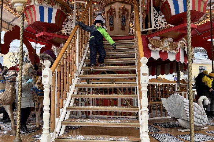 Ярмарка работает на трех площадях. На Дворцовой есть горка. На Манежной — каток и лужи