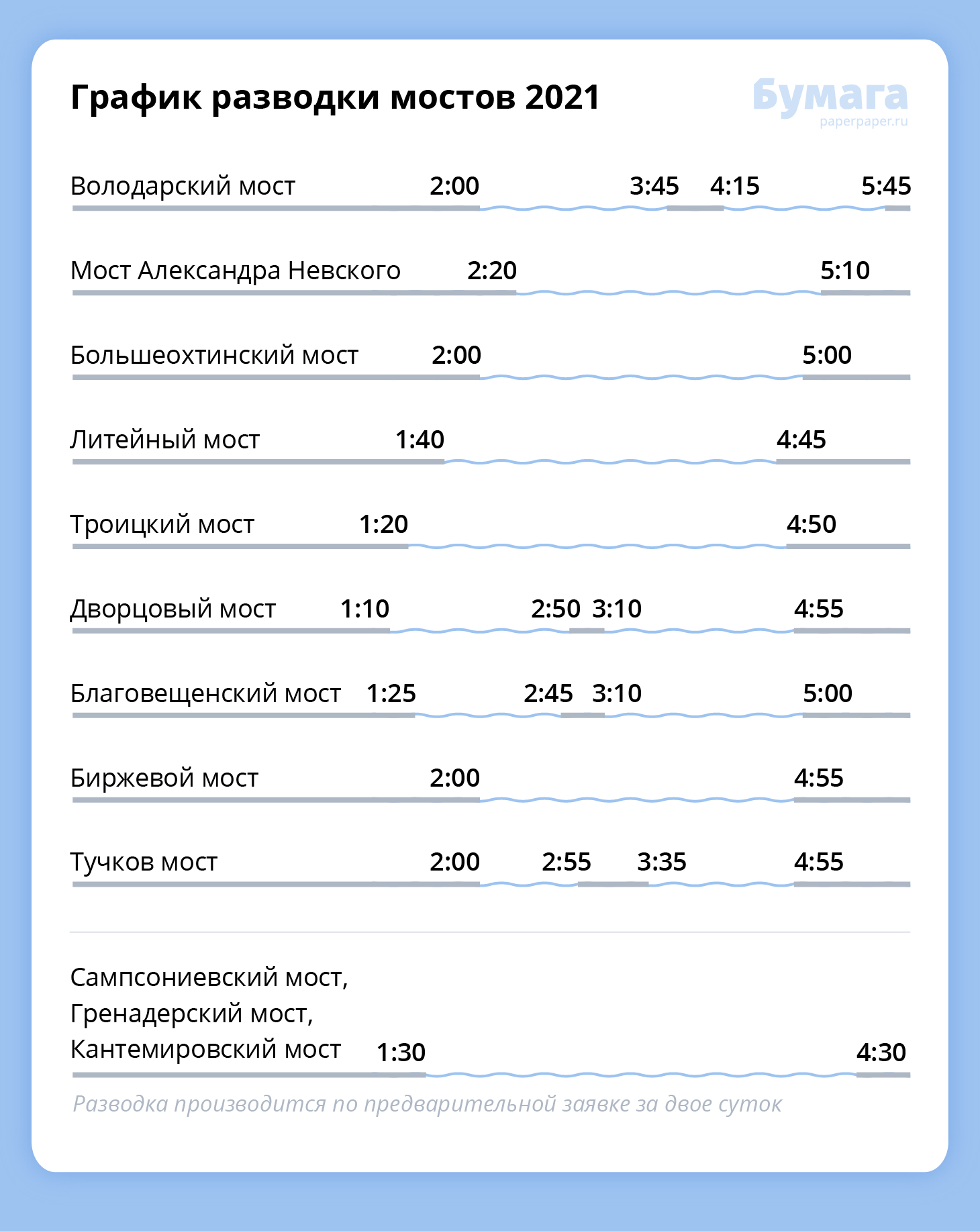 В Петербурге в 2021 году регулярно разводят двенадцать мостов. Дворцовый, Благовещенский, Володарский и Тучков мосты в этом сезоне закрывают дважды за ночь. «Бумага» публикует график разводки.