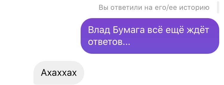 Порой эта путаница становится поводом для шуток со стороны людей, у которых я запрашиваю интервью. Вот скриншот из сторис девушки, смеющейся, что ей написал Влад Бумага.