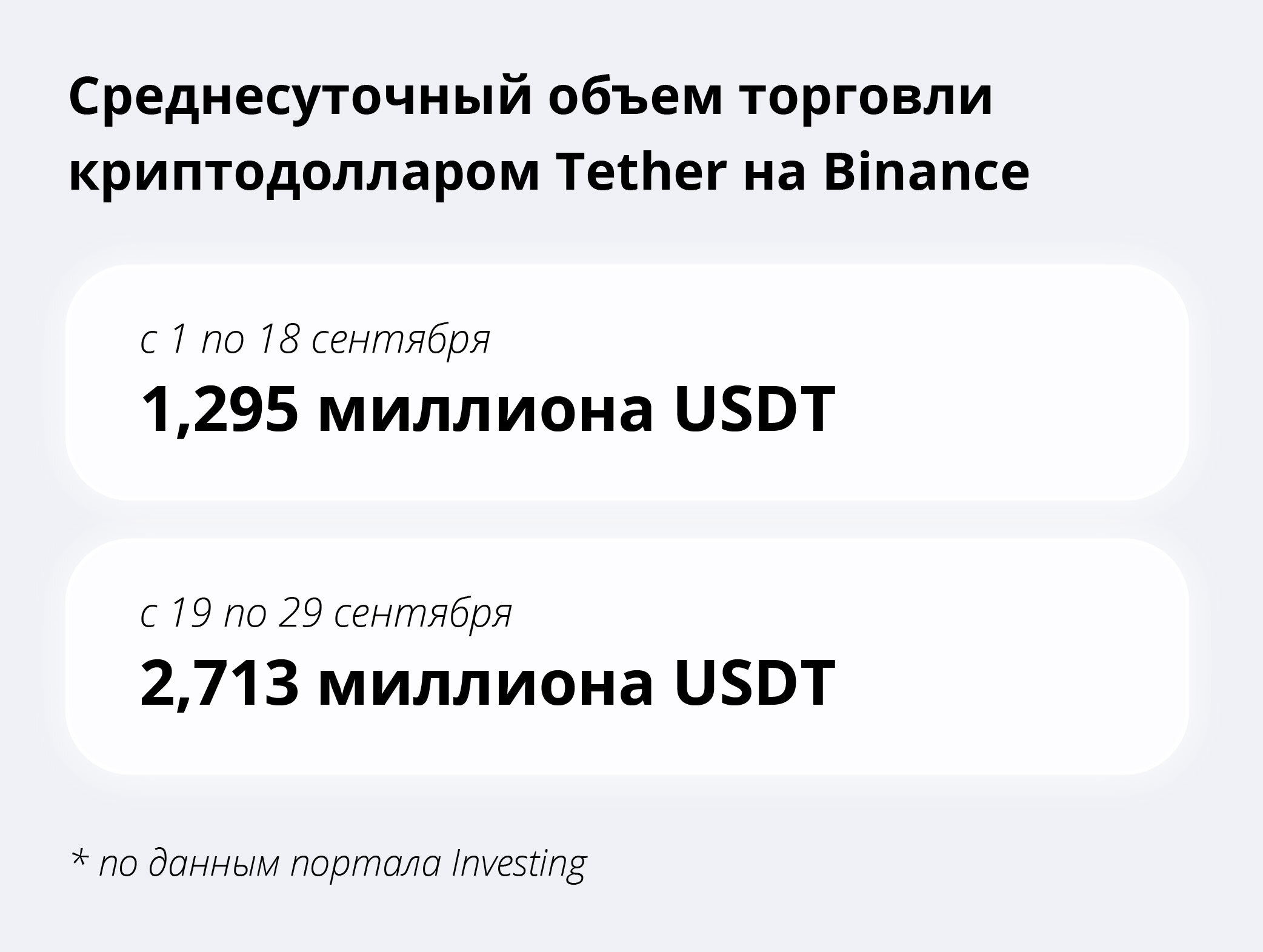 Полной статистики по объему торгов криптодолларами за рубли в открытых источниках нет, однако на портале Investing представлены данные по паре RUB — USDT с биржи Exmo и P2P-платформы биржи Binance.