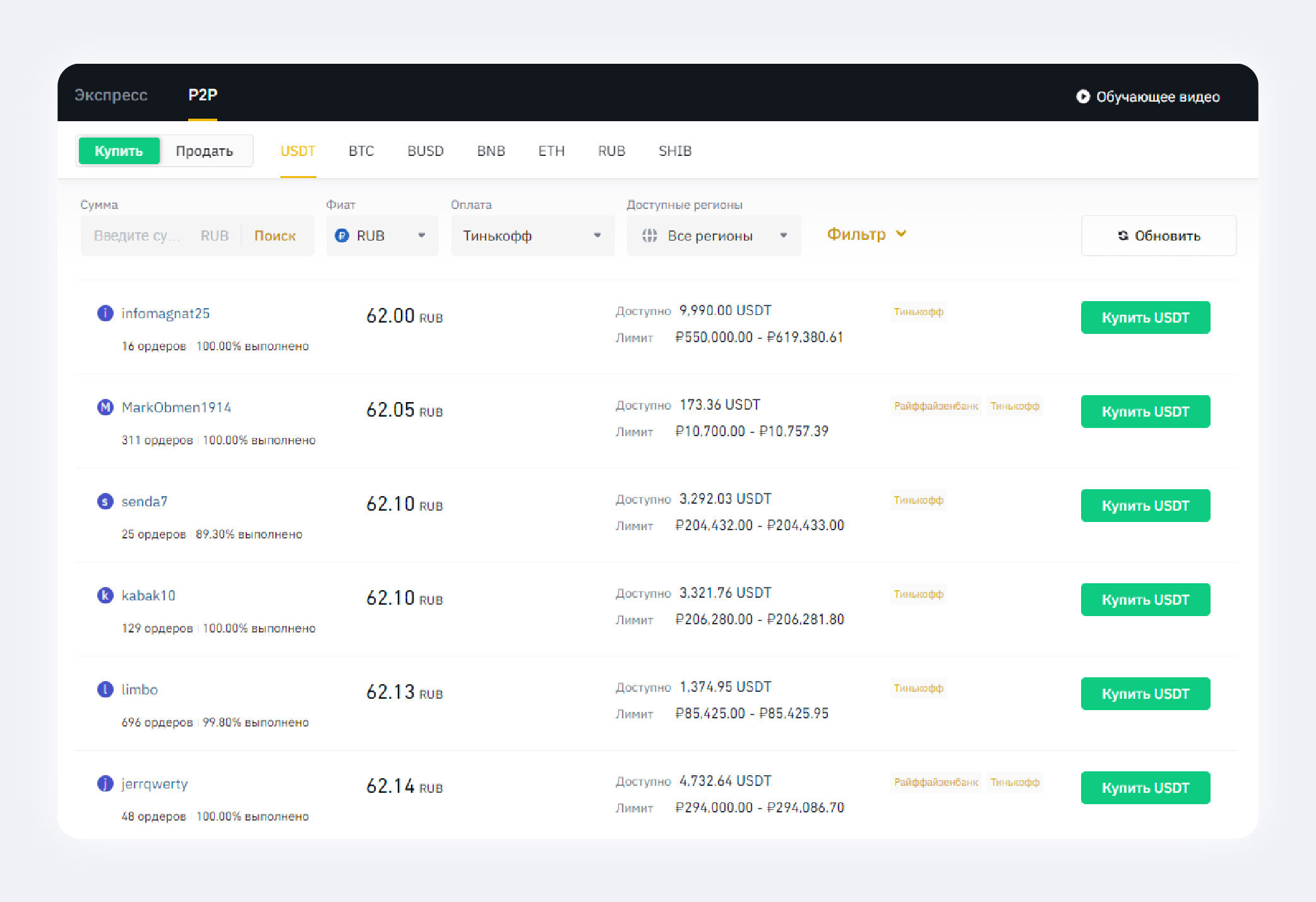 Рядом с никнеймами продавцов есть информация о количестве ордеров и проценте выполненных заказов. Чем выше оба этих показателя, тем лучше.