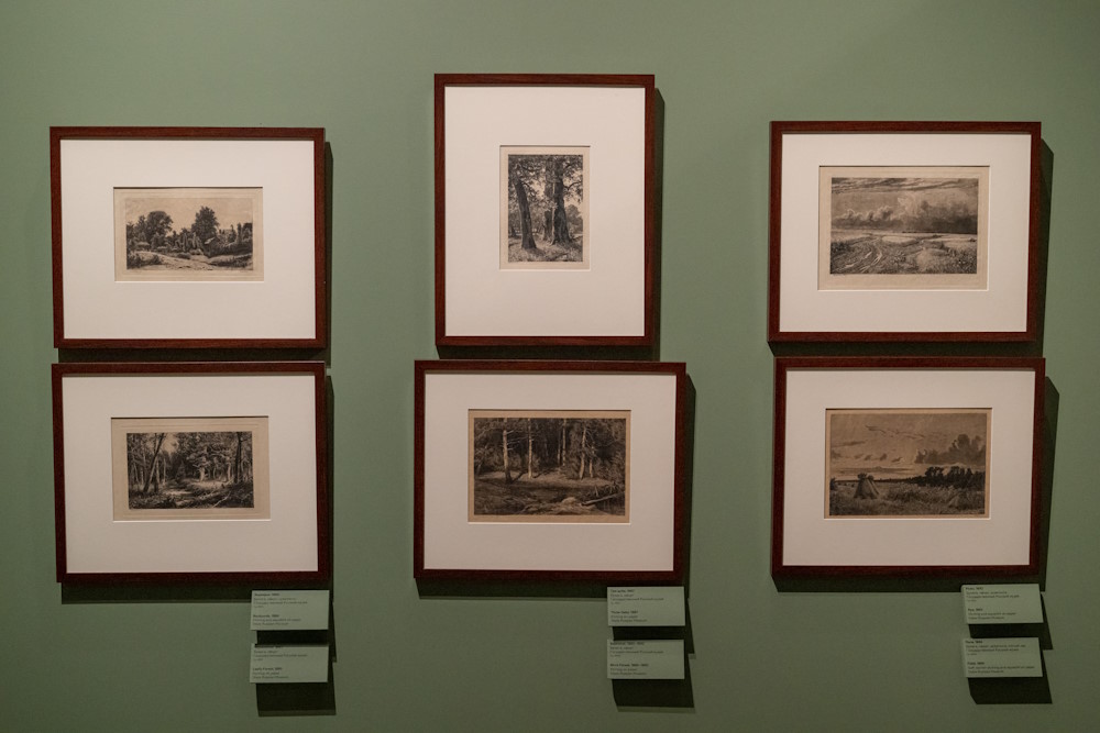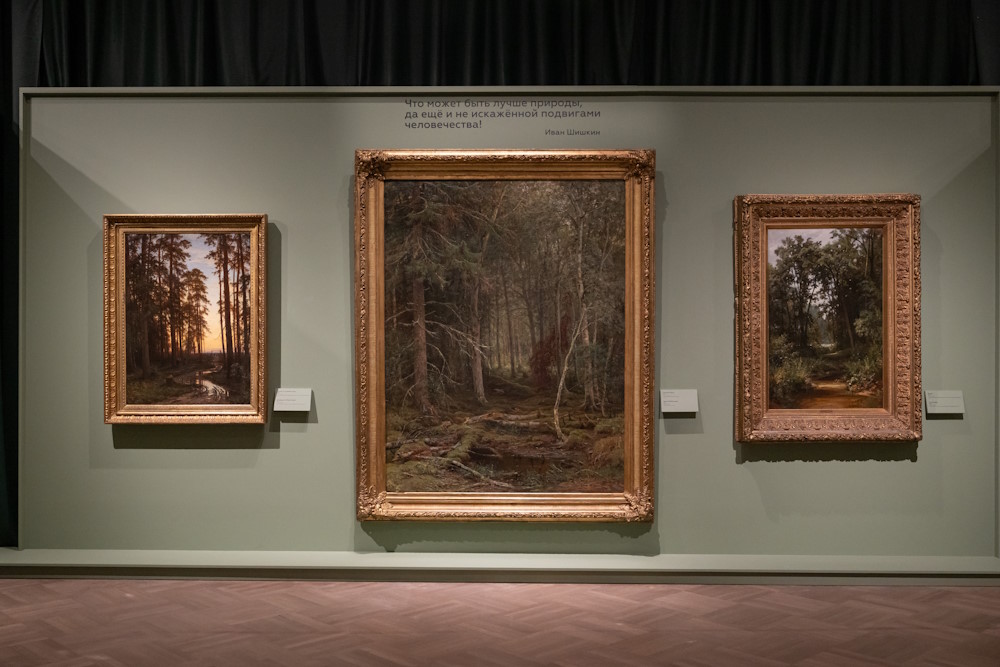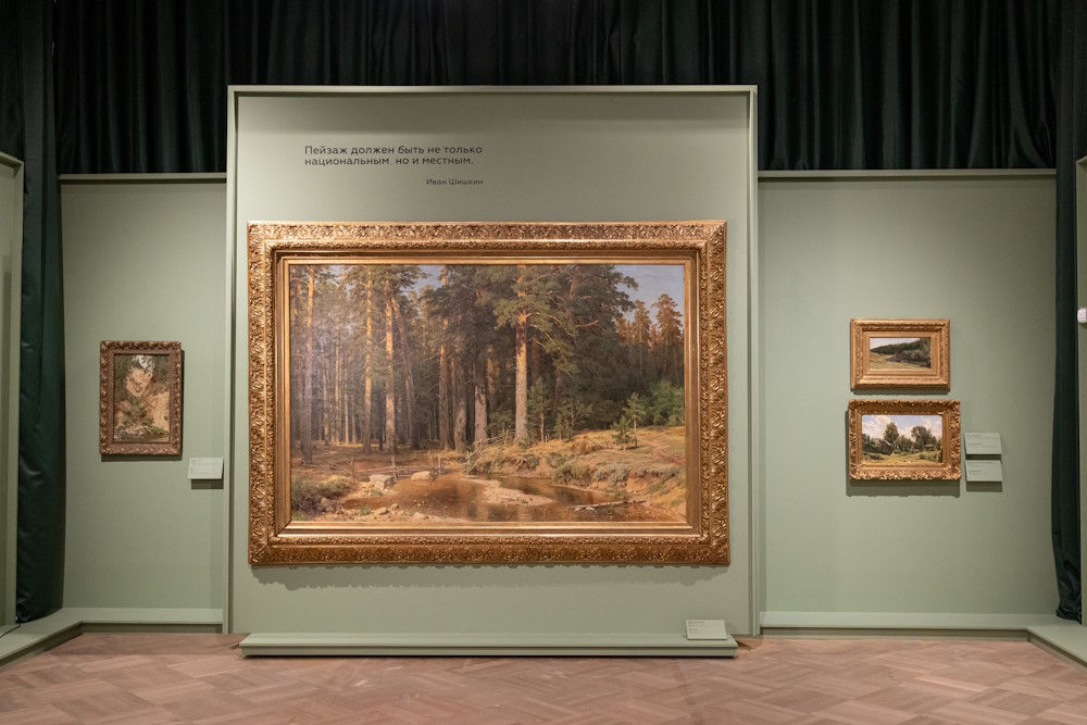 Новая ретроспектива следует тем же принципам, что и другие похожие выставочные проекты Русского музея. Залы оформили в спокойном салатовом цвете, живопись соседствует с графикой, а большие полотна — с этюдами (увидеть можно, например, ранний шишкинский этюд «Сосна на скале», отреставрированный специально к выставке).