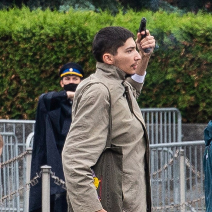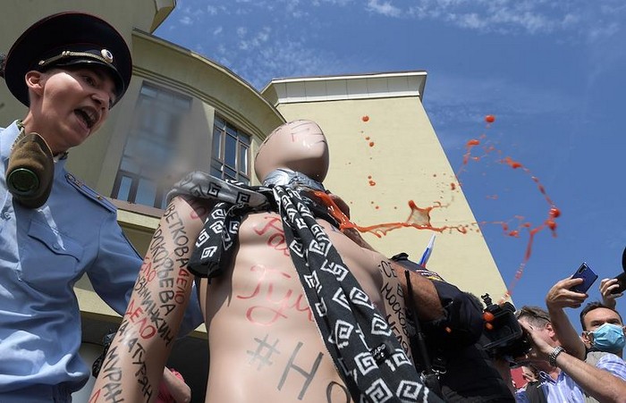 Август 2020 года. Перформанс перед приговором по делу «Нового величия» в Люблинском районном суде Москвы. В форме полицейского Крисевич «перерезал горло» манекену, наполненному красной жидкостью.