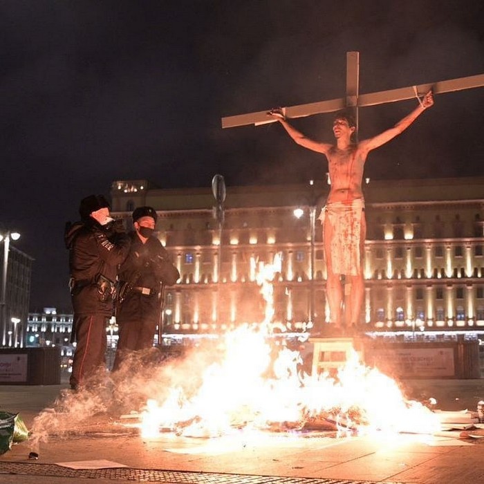 Ноябрь 2020 года. В образе Иисуса Крисевич привязал себя к кресту перед зданием ФСБ на Лубянке. Вокруг себя он раскидал горящие папки с уголовными делами.