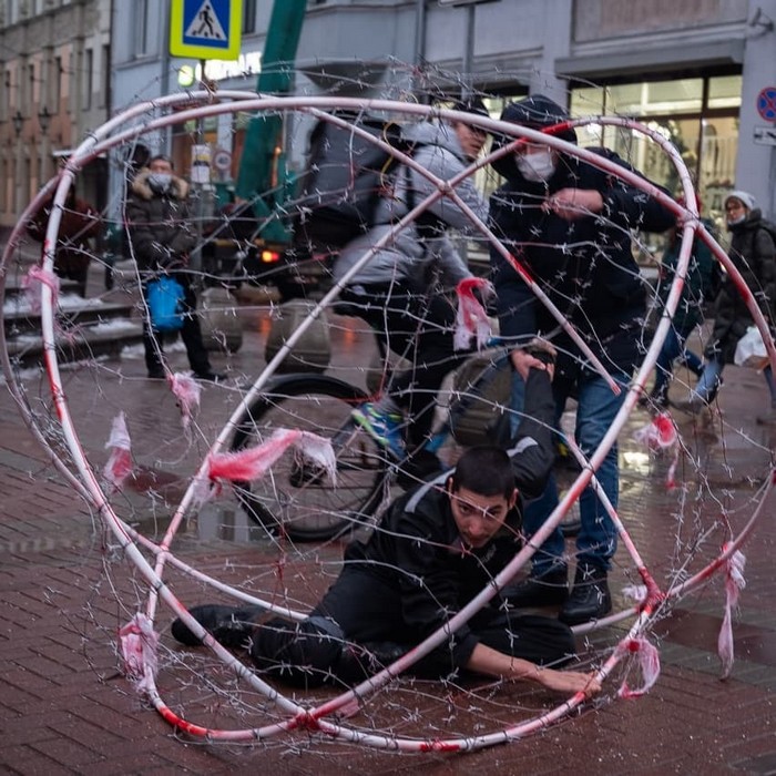 Январь 2021 года. Крисевич заковал себя в шар из колючей проволоки на московском Арбате.