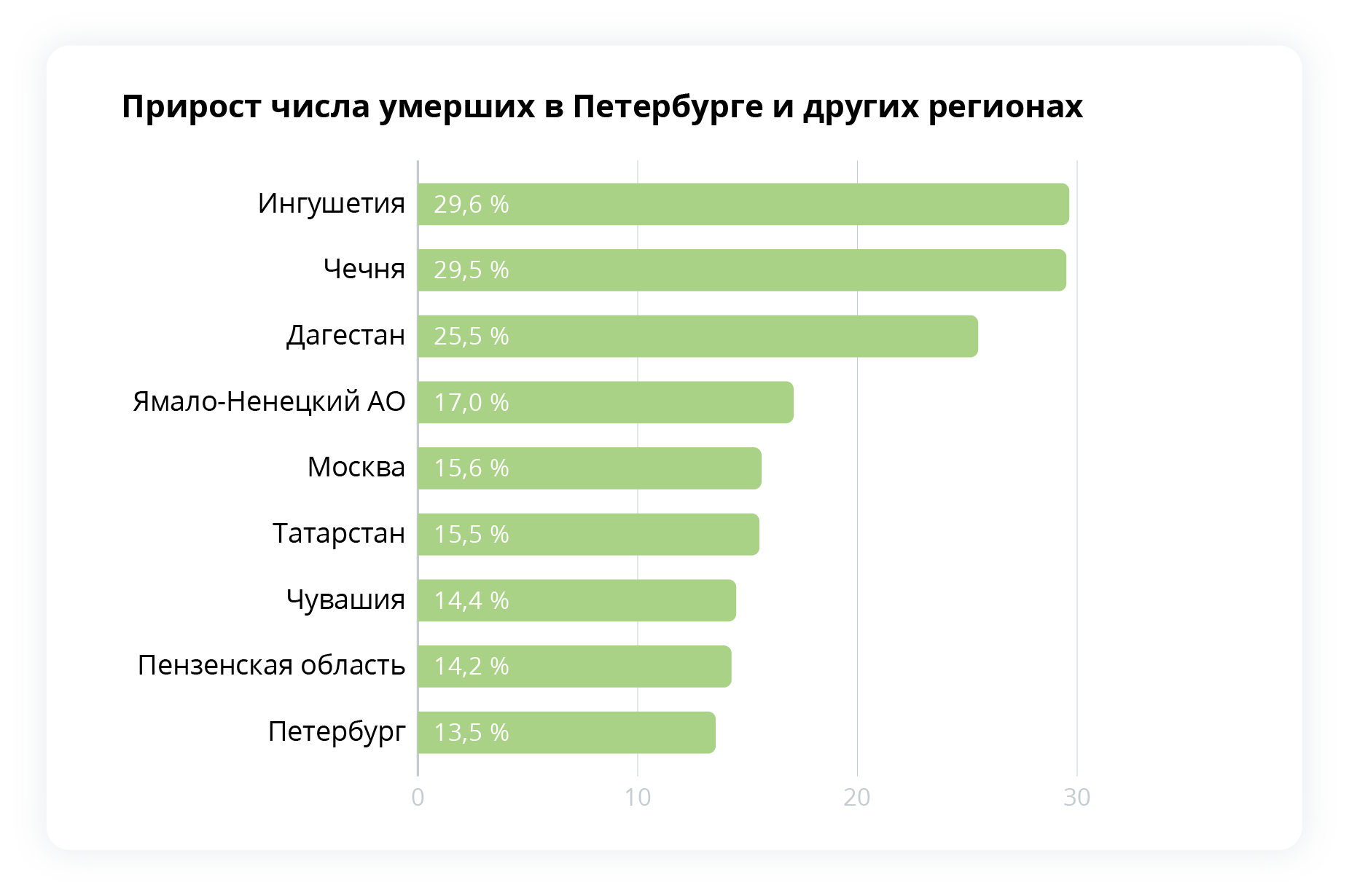 Если проанализировать этот же показатель, но не с начала года, а с апреля, когда началась пандемия, Петербург окажется на шестом месте среди регионов России по приросту смертности, говорит Ракша. На первых трех местах всё так же Чечня, Ингушетия и Дагестан.