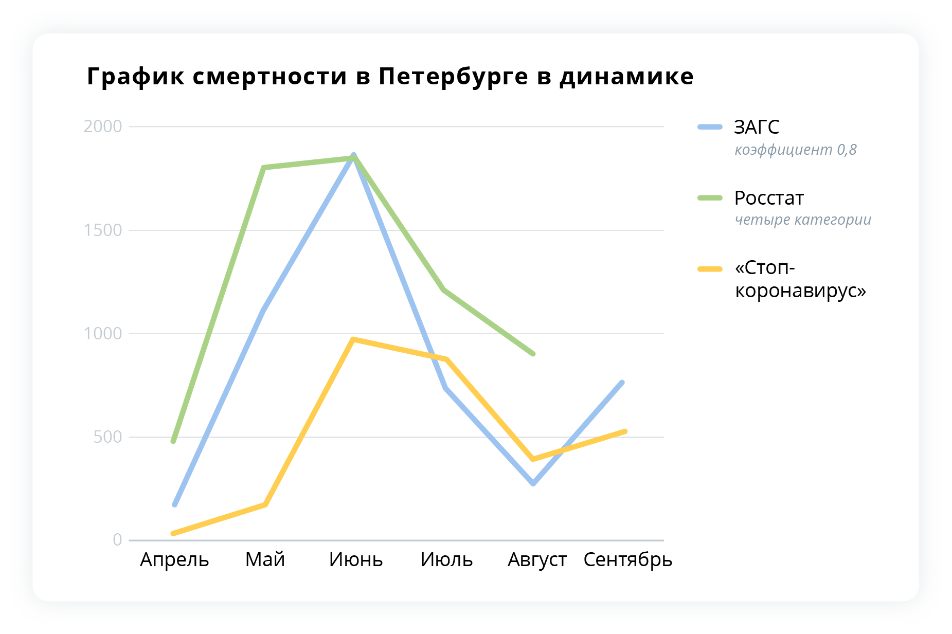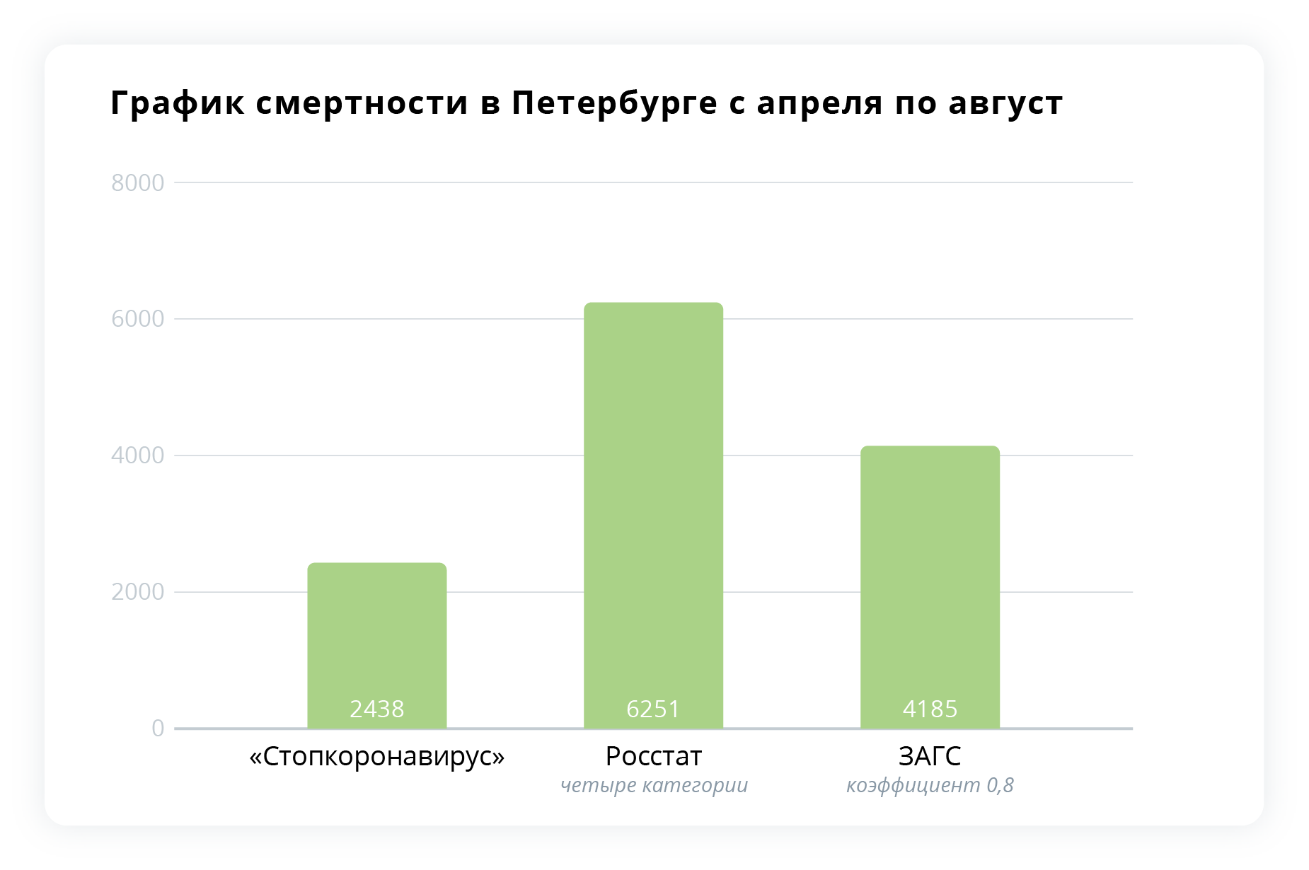При этом информация с двух ресурсов за конкретный месяц отличается: например, в статистике смертности «Стопкоронавируса» по Петербургу с апреля по август учтено 2438 погибших, а в обобщенных данных Росстата — 6251. Это связано с разными методиками подсчета.