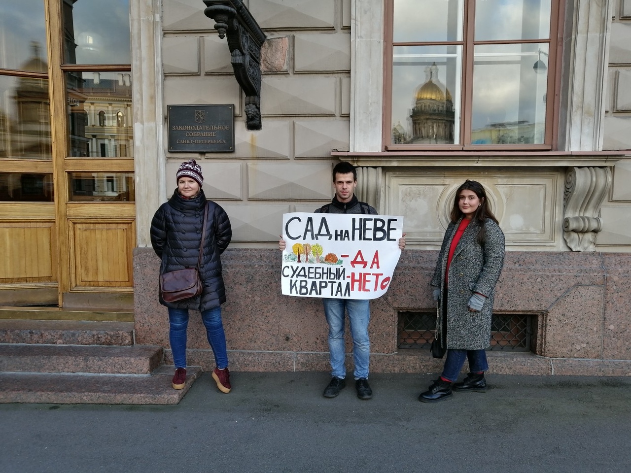 Судебный квартал, который должен был появиться у Биржевого моста, теперь хотят построить на месте сада на Неве. Депутаты уже исключают участок неподалеку от Смольного из списка зеленых насаждений. Градозащитники устраивают акции против стройки, потому что в центре и так мало зеленых зон.