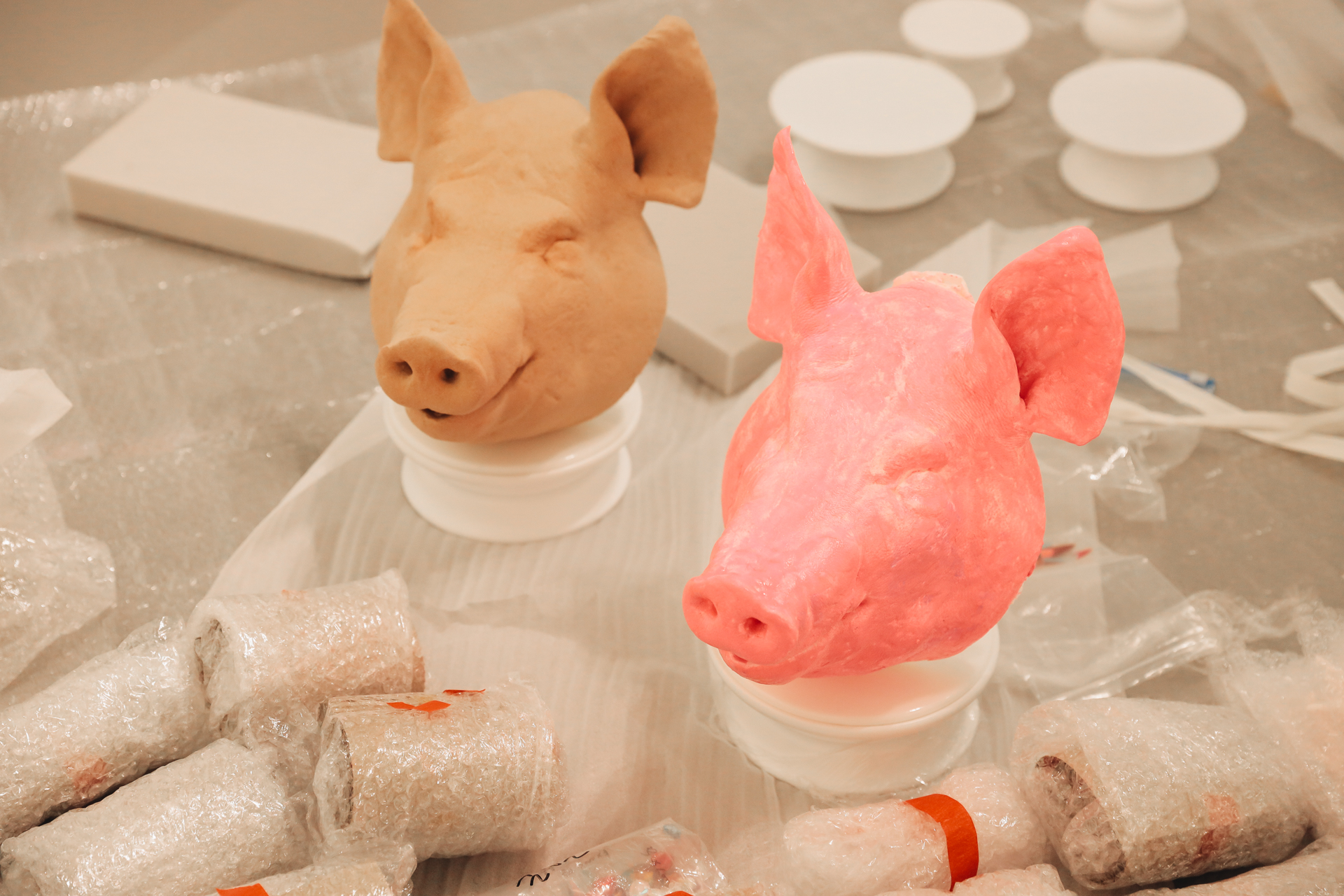 Для подготовки к перформансу свиную голову из косметического воска, раскрашенную лаком для ногтей, нужно было покрыть стразами. Художница прислала две головы на тот случай, если с первой что-то пойдет не так (но она не потребовалась).