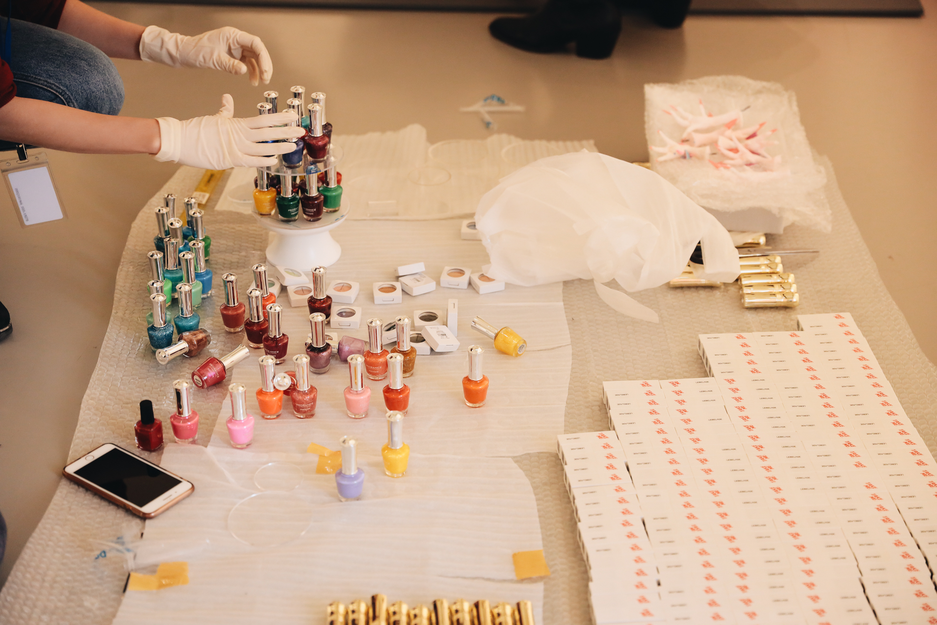 Стоит сказать, что это одна из самых сложноструктурированных инсталляций на выставке. Для начала нам нужно было освободить сотни теней, румян, лаков и помад из коробок и рассортировать их по цветам (чтобы после окончания выставки упаковать их обратно).