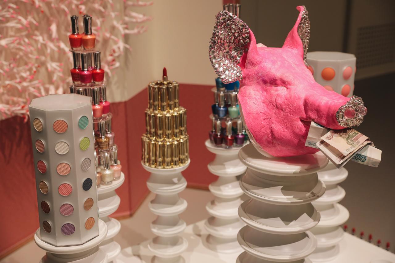 Одна из ярких работ проекта — инсталляция художницы Даин Пак «Культ красоты». Она состоит из десятков тюбиков помад, восковой головы свиньи и пластиковых куриных лап с накрашенными когтями. Из-за пандемии сотрудникам музея пришлось монтировать работу без участия художницы.