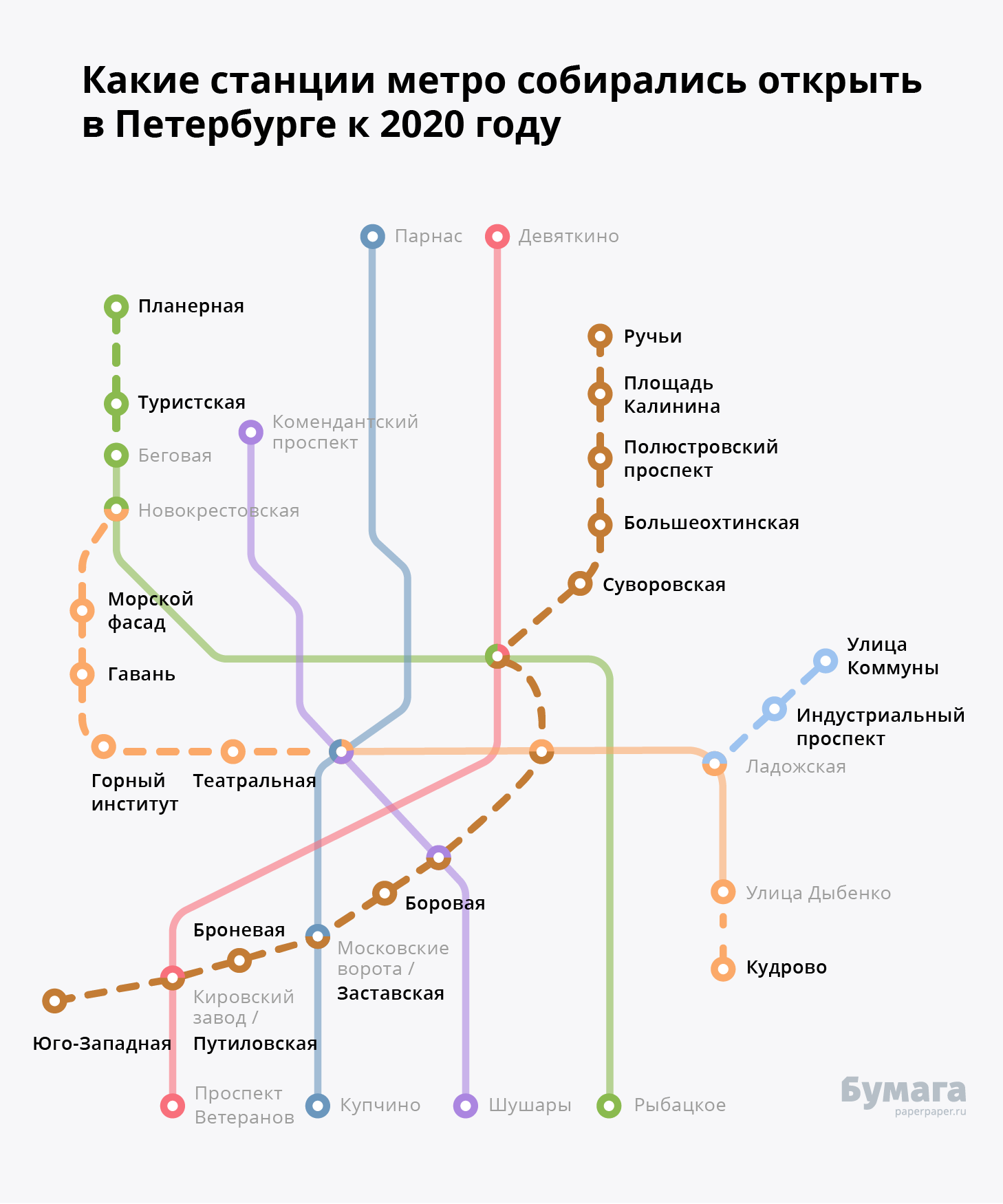 В ближайшие два года власти не планируют открывать станции метро. На 2022-й запланирован запуск «Горного института», который изначально хотели ввести в эксплуатацию до 2015-го. «Бумага» показывает, как бы выглядело петербургское метро, если бы сроки открытия станций не срывали.