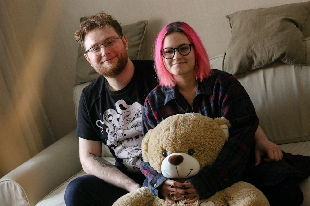 А: У меня там было, что я недавно переехала в Петербург, мне скучно и я ищу себе собутыльников на вечер. А у Леши стояла странная фотография, на которой он в розовой шапке-ушанке. Во время переписки он был скромным и зажатым — он интроверт, а я наоборот. И мне показалось, что будет сложно, когда мы увидимся вживую.