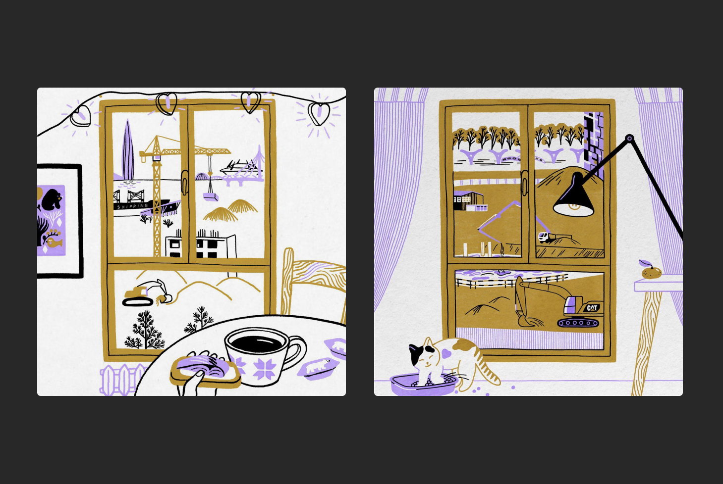 Петербурженка Юля Чайцына — дизайнер, копирайтер, художник. Девушка всегда любила рисовать истории, а после переезда на намыв начала подмечать сюжеты и в своем и соседних ЖК. Так появилась серия о жизни на намывных территориях Васильевского острова и добрососедстве с Финским заливом.