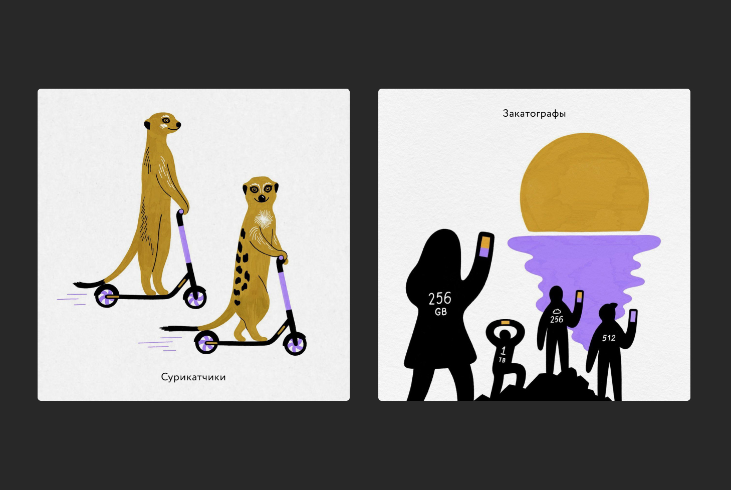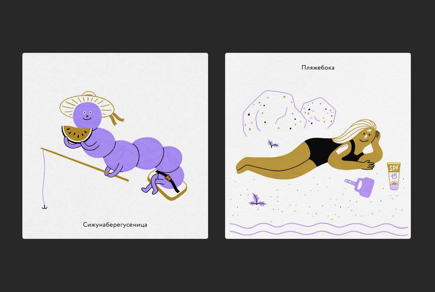 Я много гуляю по своему району и подмечаю разные тенденции. Например, летом люди очень любят посидеть у воды после рабочего дня. Так появился образ «Сижунаберегусеницы». Еще одни завсегдатаи берега, которых можно встретить в любую погоду у кромки воды, — «Закатографы», существа черного цвета с изогнутой рукой и очень хорошей памятью, не менее 256 Гб.
