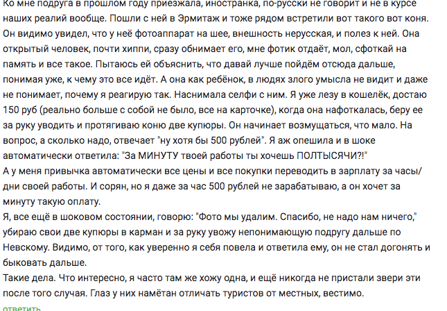 От назойливых аниматоров страдают и туристы. В посвященном Петербургу выпуске программы «Ревизорро» телеканала «Пятница» туристка из Китая рассказала, что человек в костюме коня потребовал у нее 4 тысячи рублей за фотографии. На вопрос ведущей программы о разбросе цен за фото аниматор убежал.