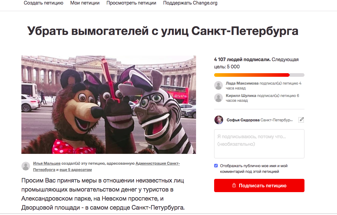 Два месяца назад на Change.org появилась петиция против ростовых кукол-вымогателей. На момент публикации материала ее подписали больше 4 тысяч человек.
