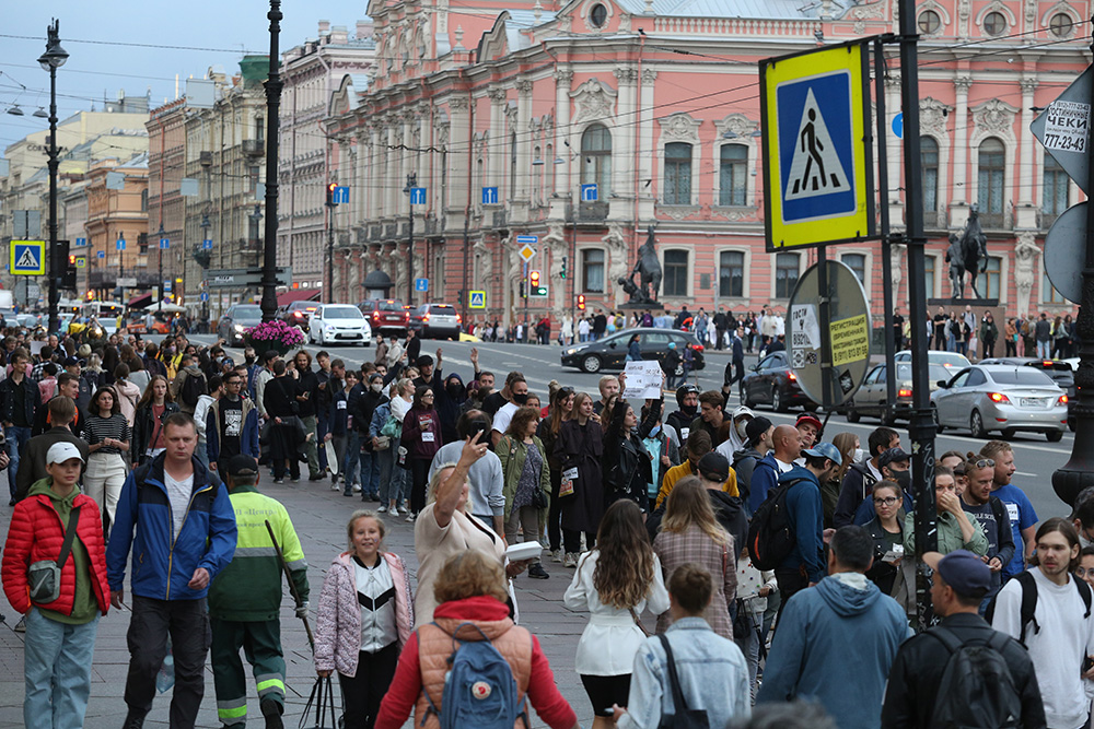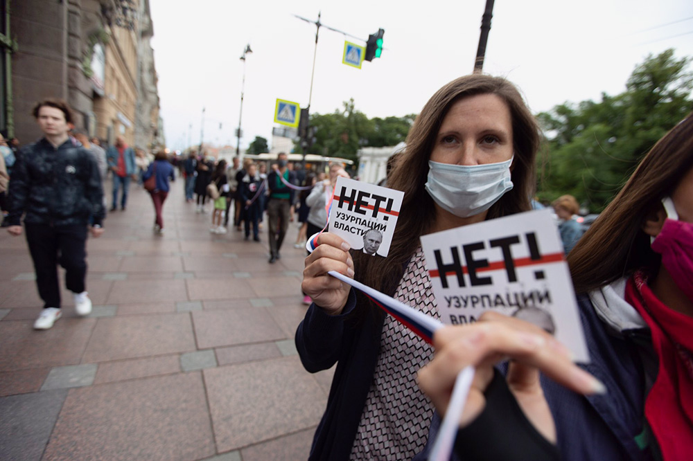 Вечером 15 июля в центре Петербурга организовали акцию из-за внесенных в Конституцию поправок. Сотни горожан встали в очередь, чтобы оставить подписи против изменений. Люди также стояли в одиночных пикетах с плакатами «Обнулэнд», проезжающие мимо автомобилисты сигналили в поддержку собравшихся.