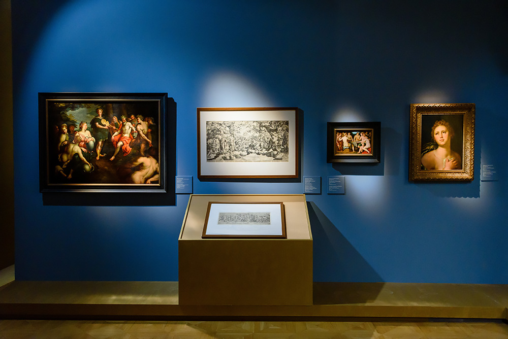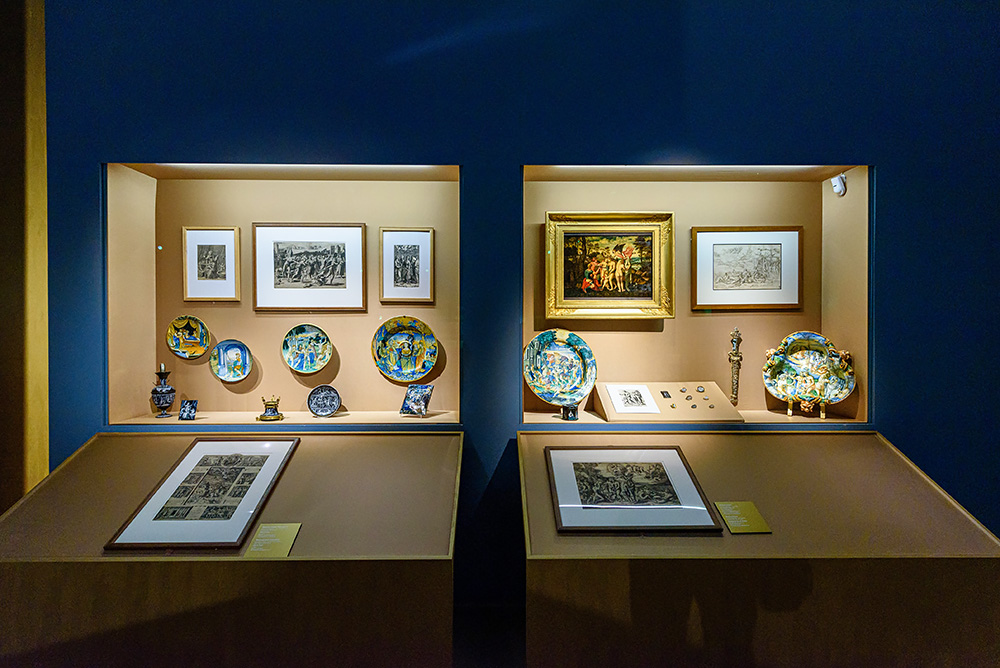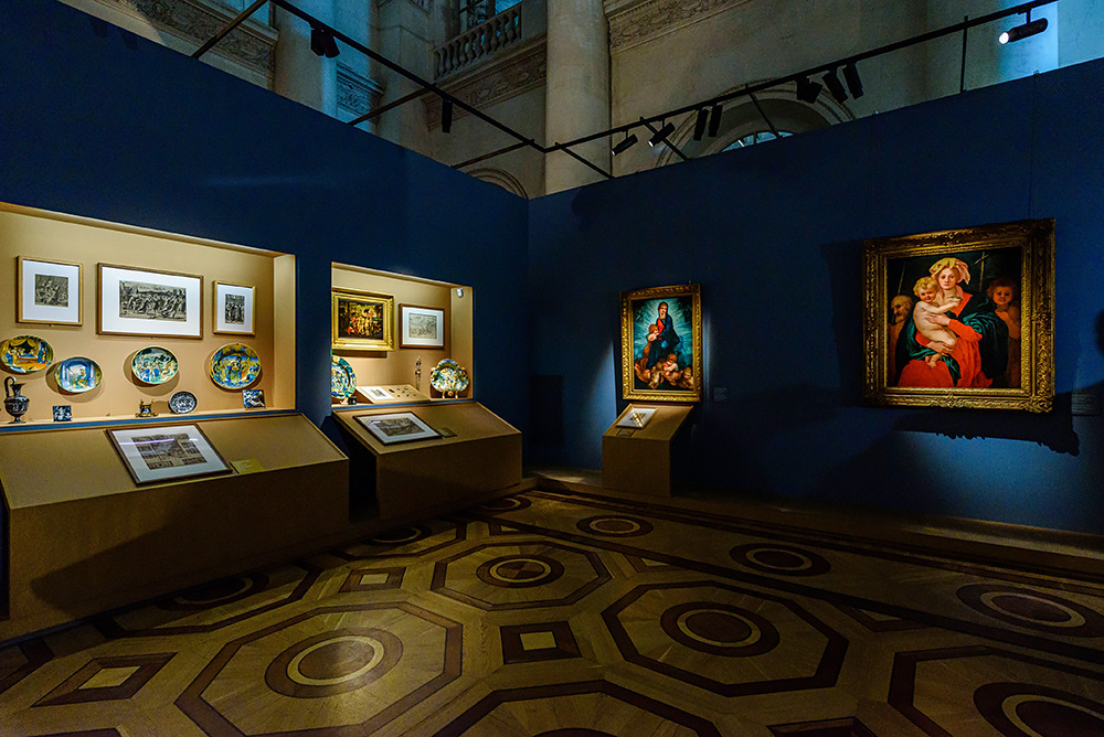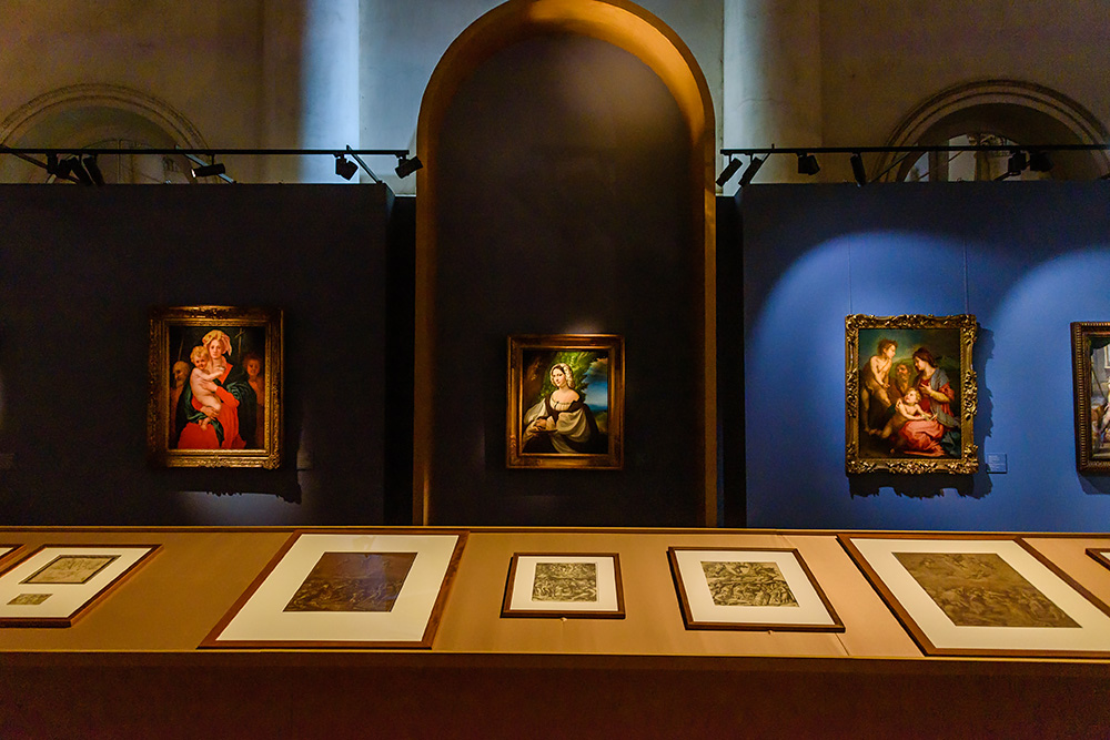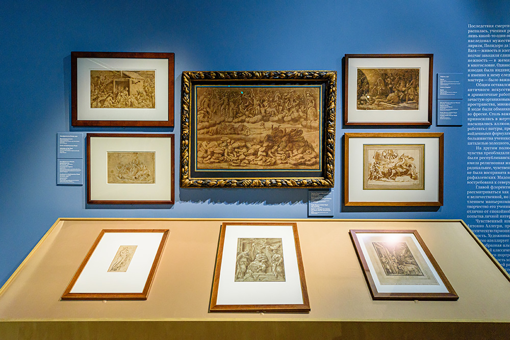 В музее выставили более 300 живописных, графических и скульптурных экспонатов: не только работы Рафаэля Санти, но и произведения Пармиджанино, Рубенса, Венецианова, Пикассо и других художников. Премьерой стали восемь монументальных фресок школы Рафаэля из собрания Эрмитажа, а жанр экспозиции определяется как «выставка-диалог».