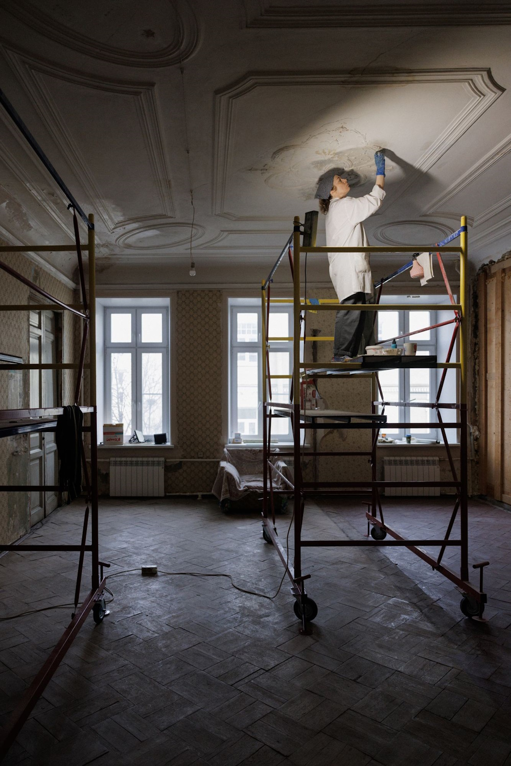 - Сохранилась до наших дней и мебель Введенских — например, шкаф в бывшей комнате прислуги. Также в квартире остались исторические элементы интерьера: паркет, лепнина на потолке, оригинальные обои.