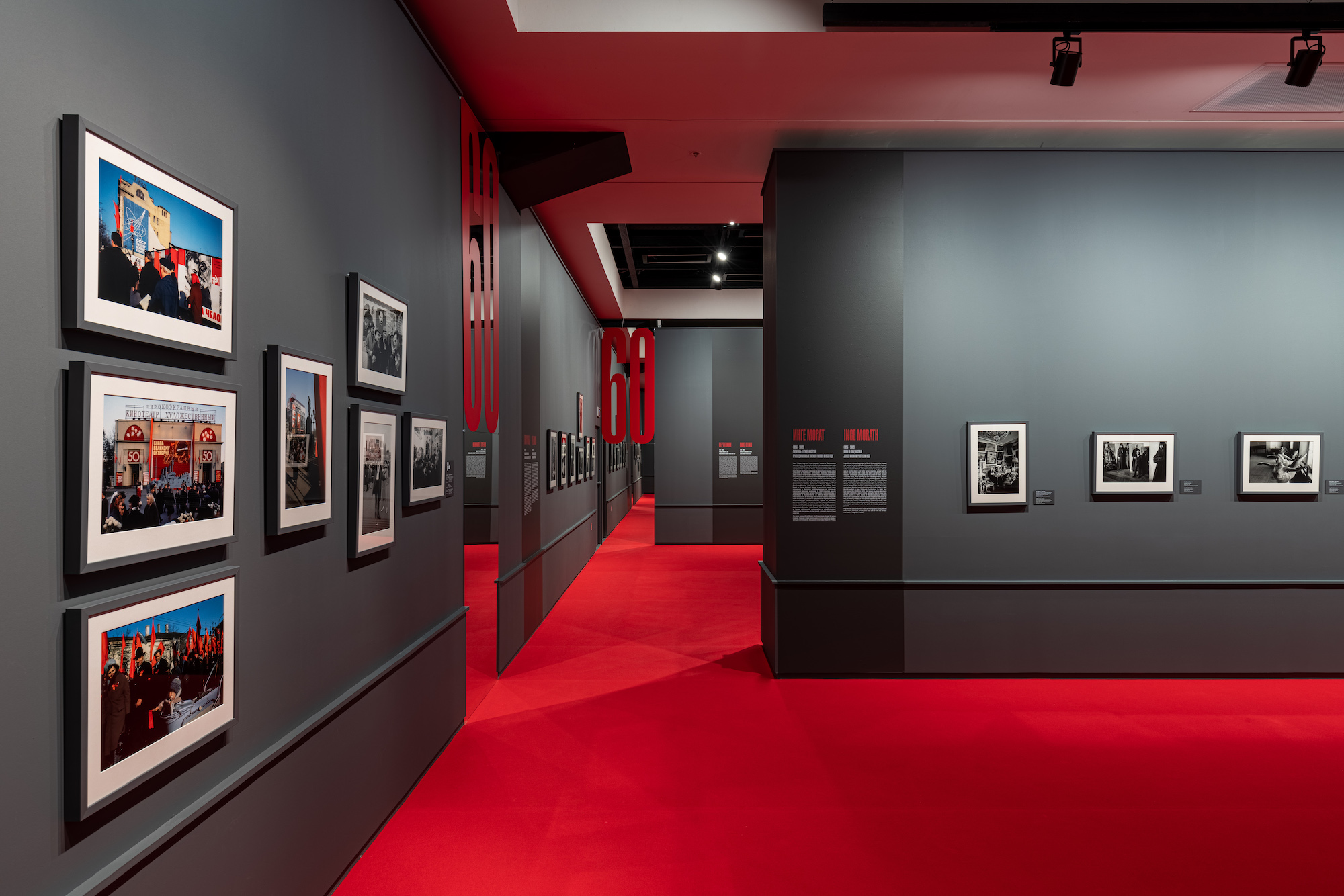 Выставка естественным образом делится на два больших периода: Советский Союз и новая Россия, это смысловое деление неплохо легло на пространство двух этажей Манежа. Первый этаж выглядит как лабиринт из достаточно закрытых залов, напоминающих образ классического музея. А наверху мы попадаем в совершенно другое архитектурное пространство; меняется и сам формат съемки, появляется цифровая фотография. Если сначала мы четко задаем трек движения посетителя от зала к залу, то на втором этаже появляется возможность самостоятельного выбора маршрута.