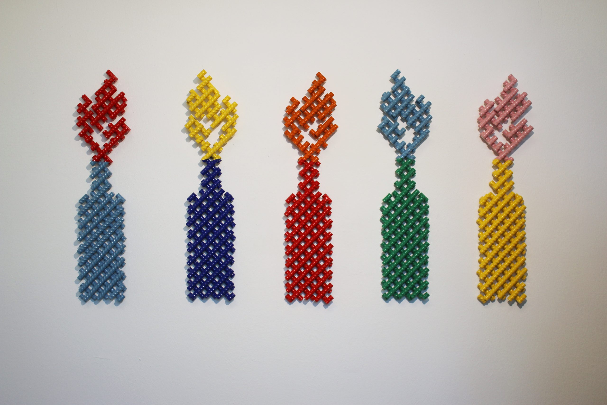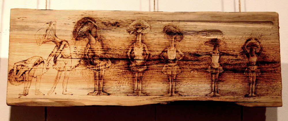 Чтобы подчеркнуть выявленные поколенческие особенности, выставку разбили на три основных раздела: «Диалог с материалом», «Внутри себя» и «Среда обитания». Первая часть посвящена работе авторов с разными материалами: от фанеры до металла. Художники действительно демонстрируют многообразие техник: Иван Тузов выложил мозаичные фигуры Чебурашки и Микки Мауса, Федор Хиросигэ создал свои работы в технике выжигания по дереву, а Константин Решетников выполнил металлические снаряды в виде редиса и чеснока на токарно-фрезерном станке.