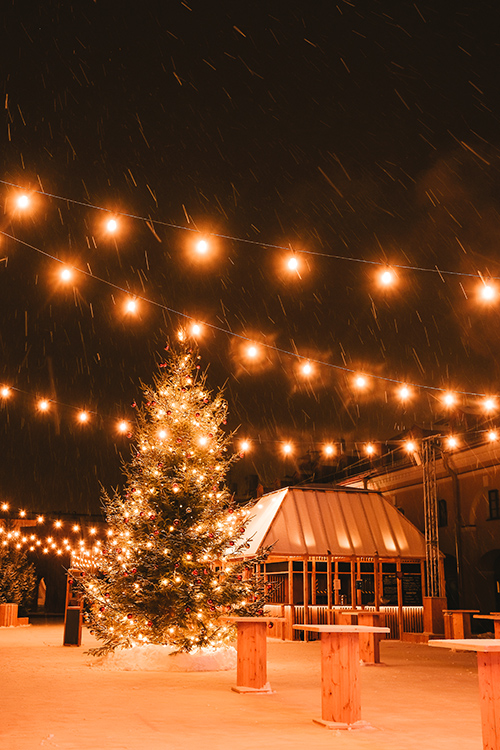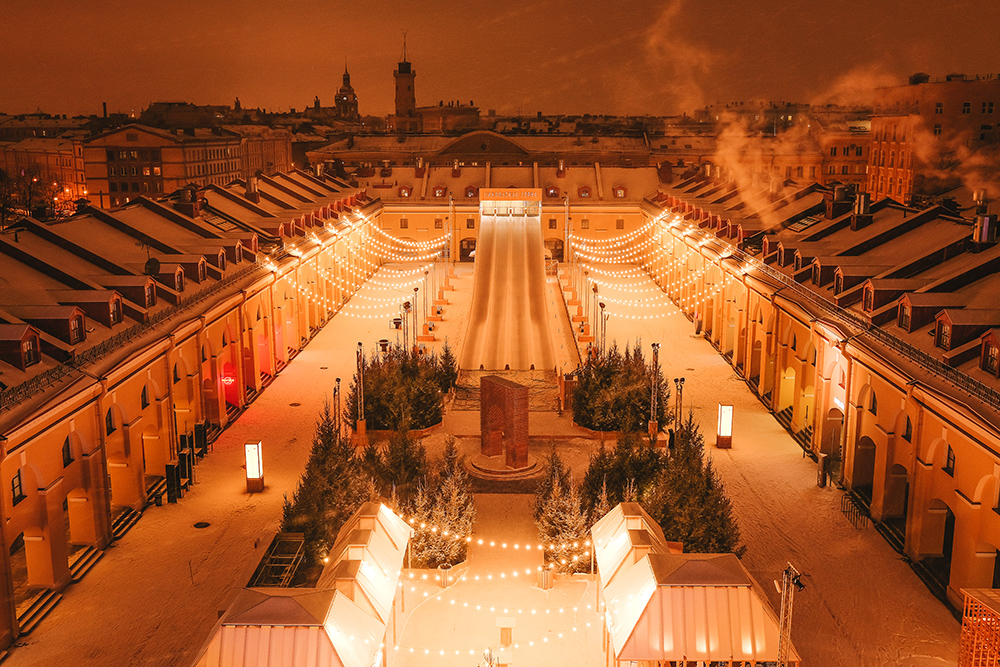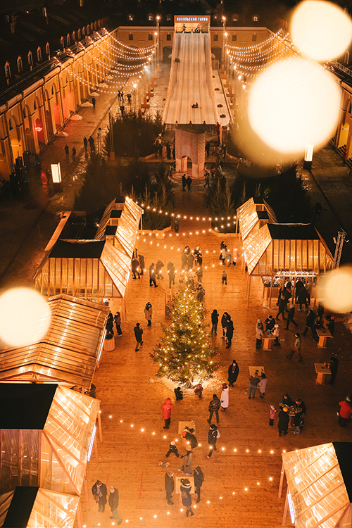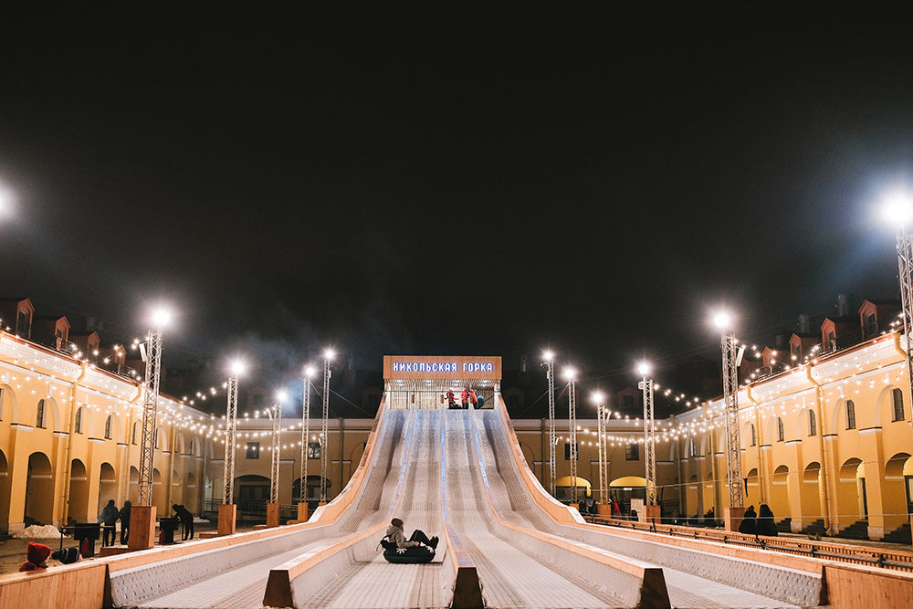 В «Никольских рядах» 23 декабря открывается зимнее пространство с рождественской ярмаркой и 70-метровой горкой. Во дворе также построили смотровую башню, с которой открывается вид на Никольский собор и Семимостье.