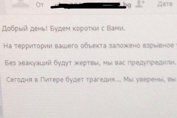Как передает «Фонтанка», все письма с угрозами рассылали с одного адреса с болгарского почтового сервиса mail.bg. У всех сообщений один и тот же текст: «Добрый день! Будем коротки с вами. На территории вашего объекта заложено взрывное устройство! Без эвакуаций будут жертвы, мы вас предупредили. Не совершайте ошибку, прольется кровь невинных людей. Сегодня в Питере будет трагедия… Мы уверены, вы не успеете обезвредить все бомбы».